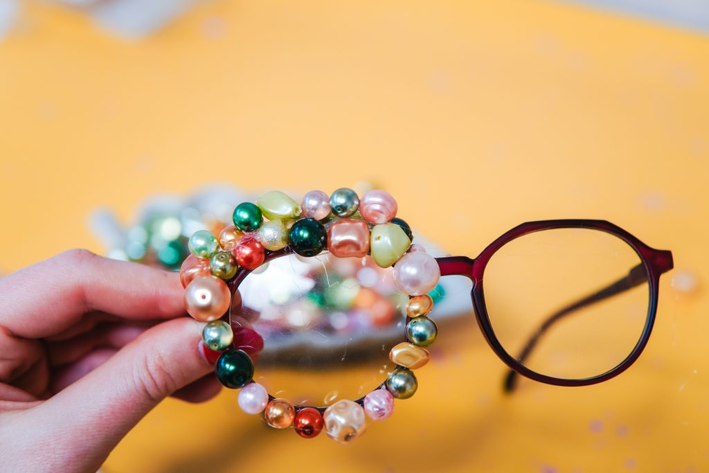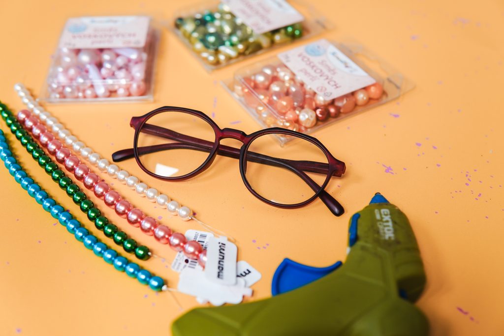 Nahřejeme tavnou pistoli a připravíme si směs korálků. Korálek po korálku lepíme na obroučky brýlí tak, jak se nám to líbí. Necháme pořádně zaschnout a brýle očistíme.