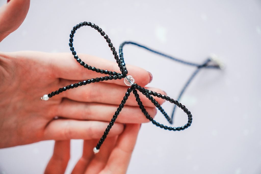 Následně opět provlečeme velkým broušeným korálkem tak, aby nám vznikl druhý konec mašle. Na něj donavlékneme malé broušené korálky a zakončíme jednou perličkou a zamačkávacím rokajlem.