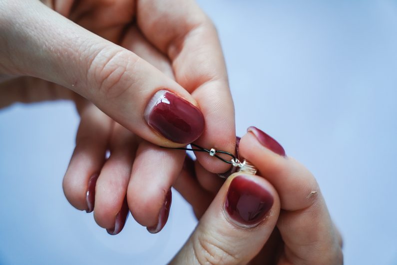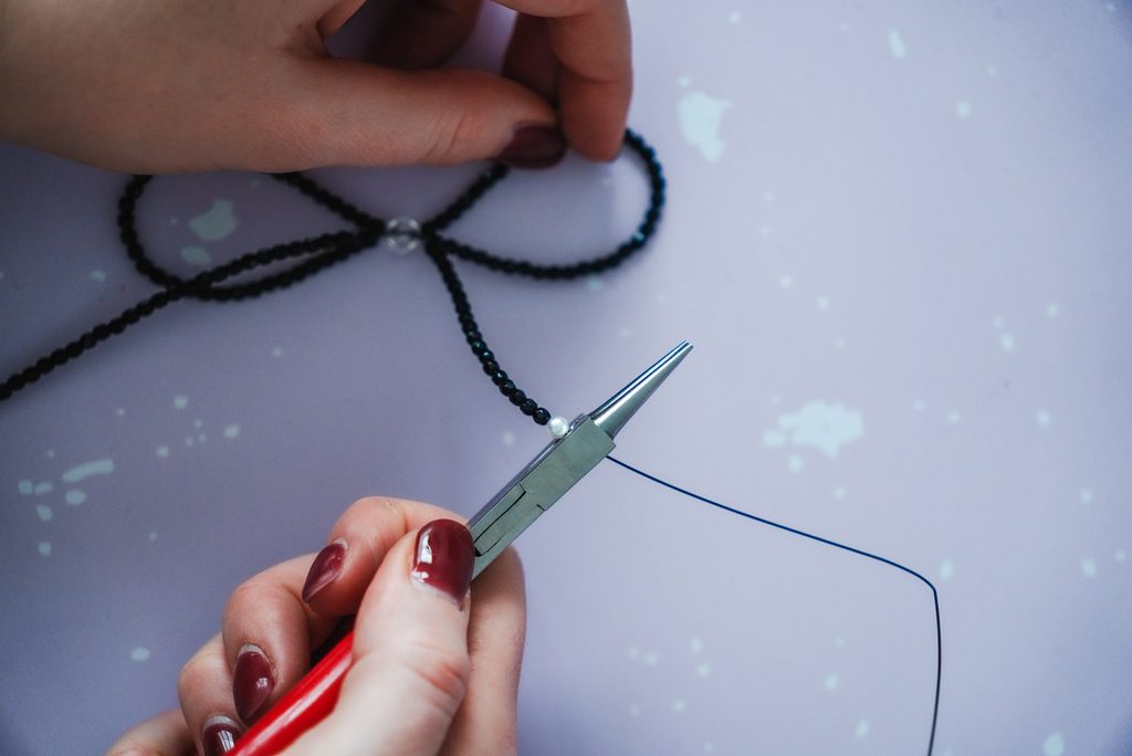 Ustřihneme si asi 1 m nylonového lanka. Na konci uděláme očko, do kterého připevníme jeden konec magnetického zapínání a pomocí zamačkávacího rokajlu a kleští upevníme.