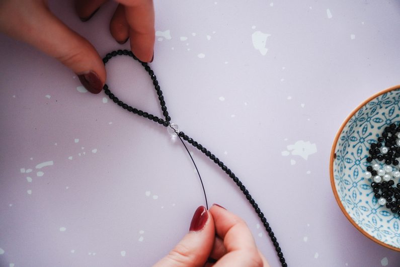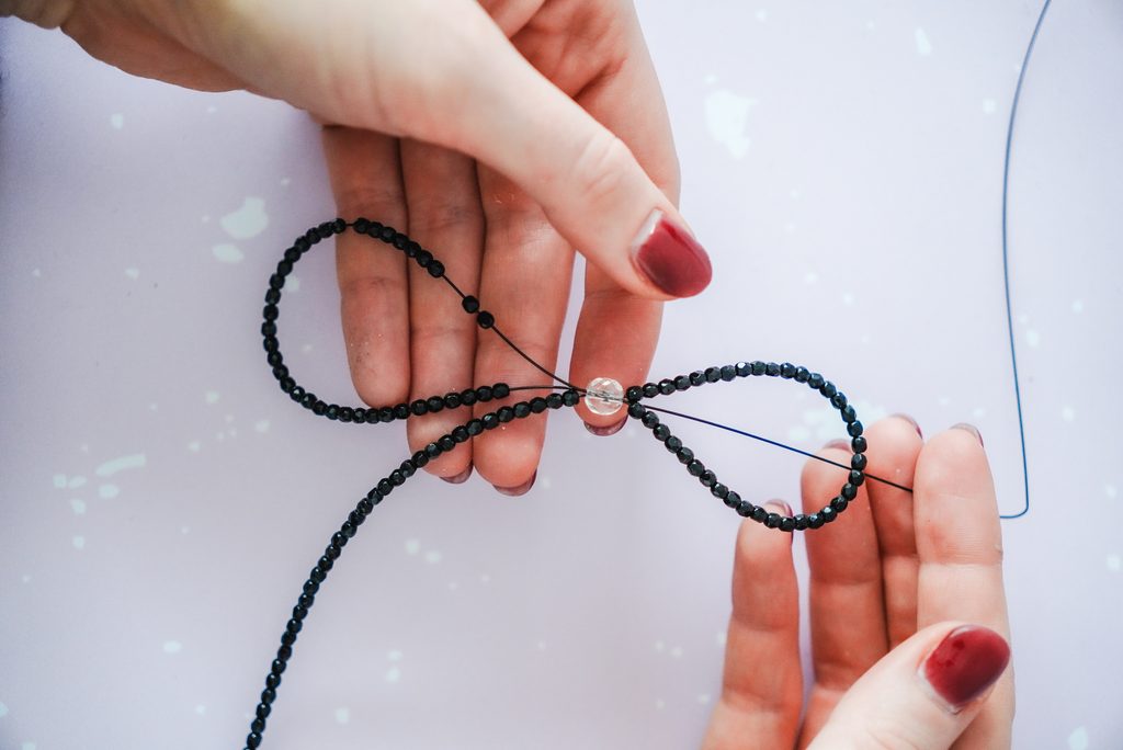 Následně volný konec protáhneme zpět broušeným korálkem, aby nám vznikla jedna strana mašle. Navlečeme dalších 15 cm malých broušených korálků a znovu křížem provlečeme velkým broušeným korálkem. Vznikne nám tak mašle a jeden její konec.