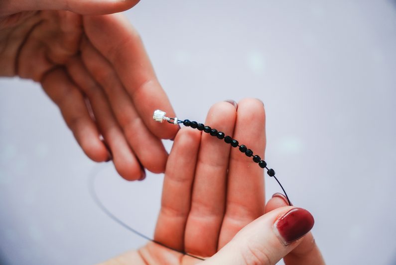 Ustříhneme si cca 30 cm nylonového lanka, opět zakončíme druhým dílem magnetického zapínání pomocí zamačkávacího rokajlu a navlečeme druhou stranu náhrdelníku. Tedy asi 23 cm malých broušených korálků.