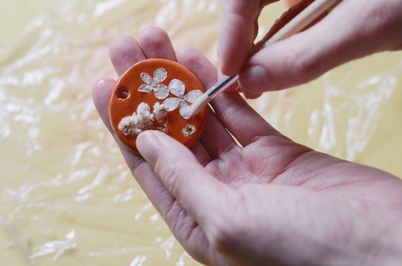 Lakem přetřete povrch medailonku, abyste jej zafixovali. Barva terakoty krásně vynikne.