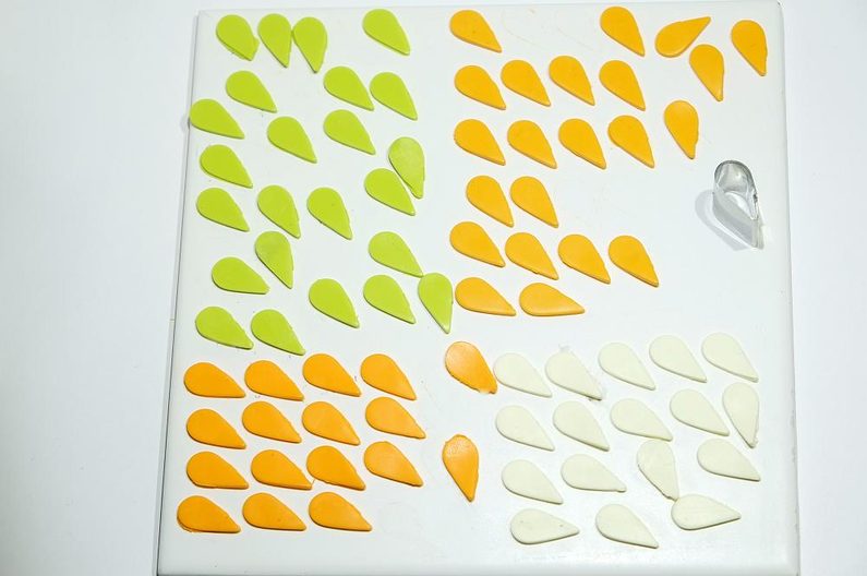 Všechny kousky hmoty dobře rozválejte válečkem a projeďte několikrát strojkem na nejširší nastavení, aby vám vznikly plátky. Žlutý plátek položte na oranžový, zaválejte válečkem a opět několikrát projeďte strojkem tak, aby se obě barvy smíchaly a docílilo se světlejšího oranžového odstínu. Plátky vyválejte na střední nastavení strojku. Plátky okrájejte na přibližně stejné obdélníčky. Odkrojenou hmotu dejte stranou, ještě ji možná použijete (záleží na tom, kolik budete chtít kvítků). Vidíte, že oranžový obdélníček ležící vpravo od zeleného je světlejší než ten ležící pod zeleným obdélníčkem – to je způsobeno právě smícháním oranžového a žlutého fima. Všechny plátky položte na pevnou podložku (skleněnou nebo dlaždici).