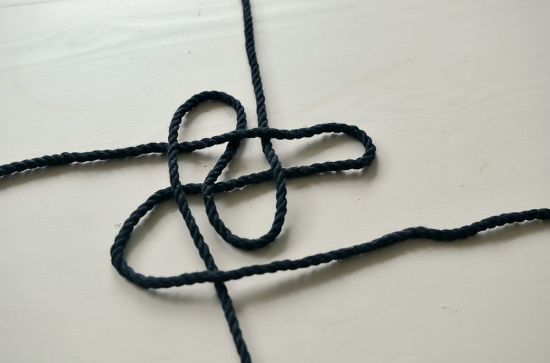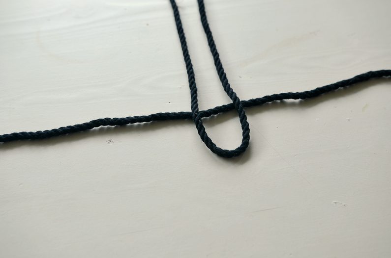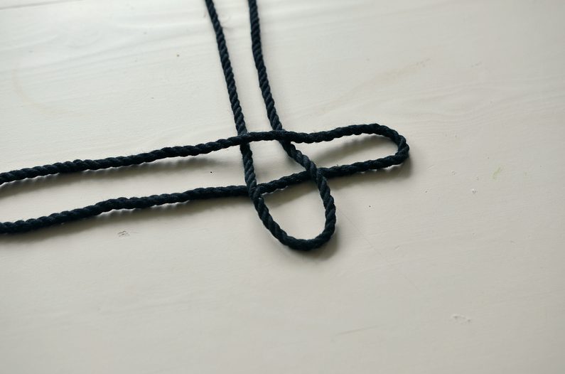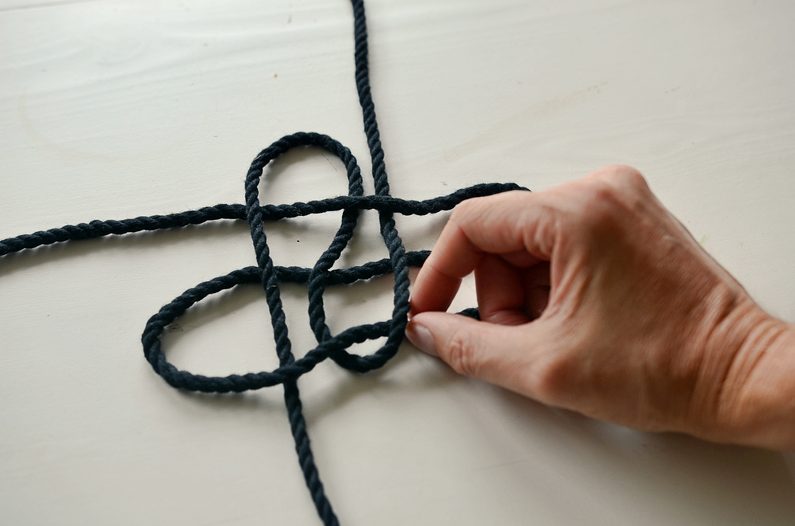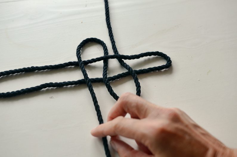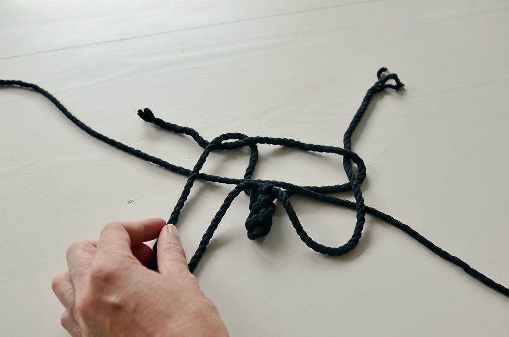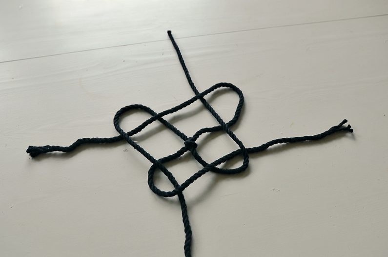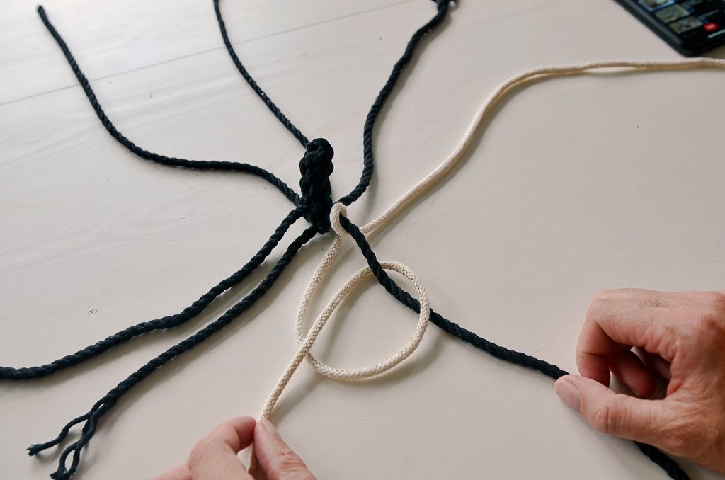 • Zapojte i zbývající 80 cm dlouhou šňůru. Položte ji středem přes dva volné konce a zapojte do korunkového uzlu stejným postupem vázání jako v předchozích krocích, jako by zde dodatečná šňůra nebyla.