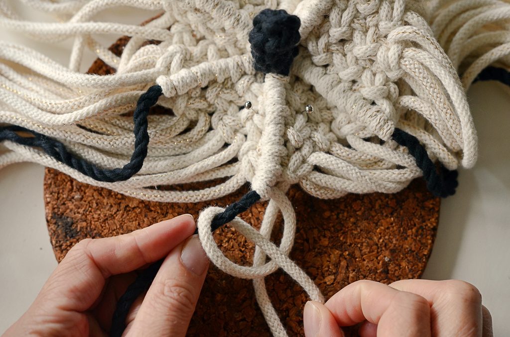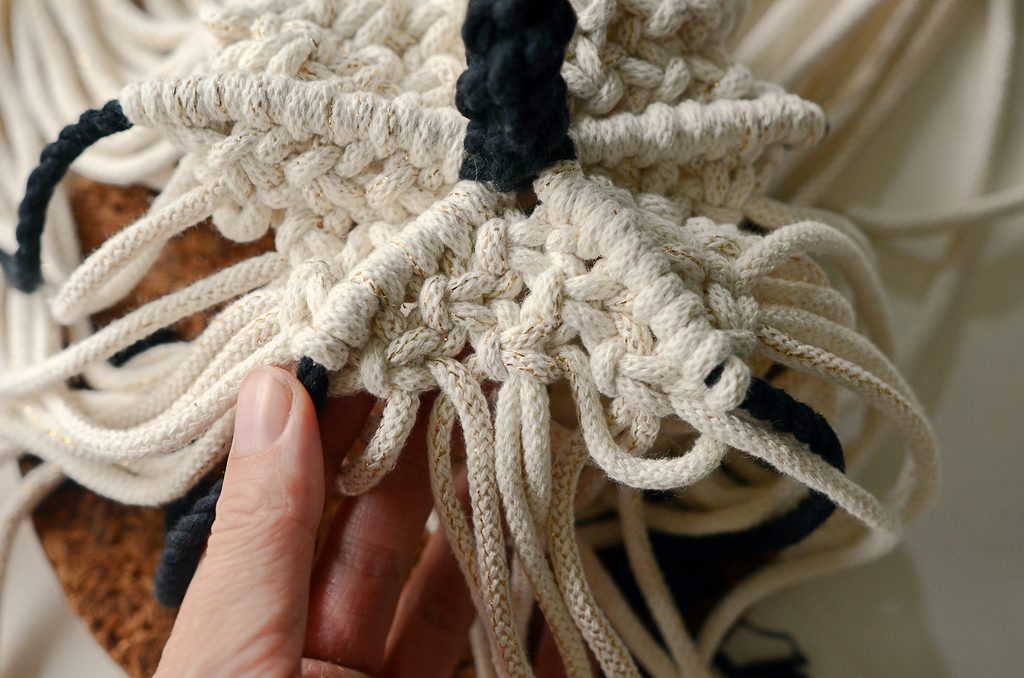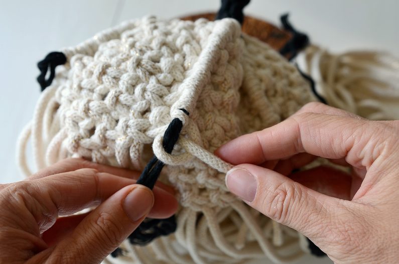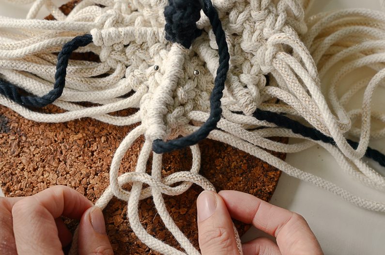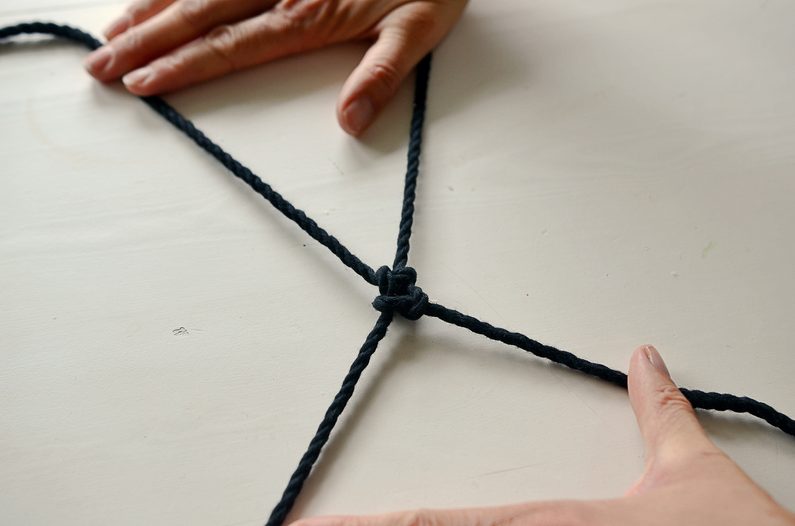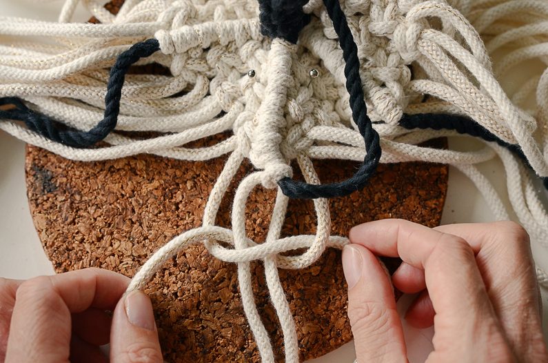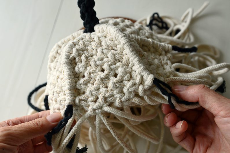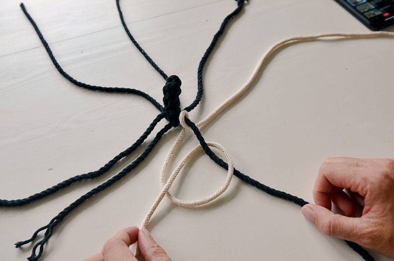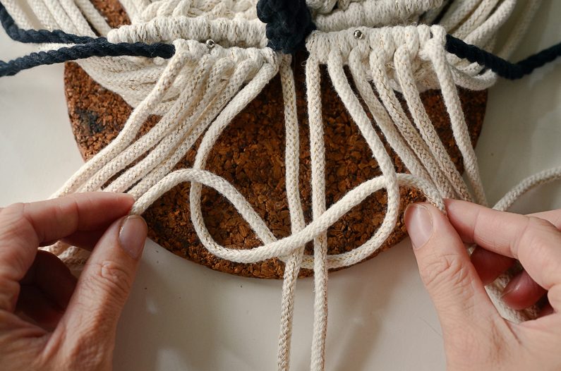 • Po dokončení tří řad je nutné prodloužit si „žebra“ dýně. Vždy dva nejbližší konce zleva a zprava kontrastní šňůry navažte dvojitým kroužkovacím uzlem. Opakujte po celém obvodu dýně. Tento krok budete opakovat nyní vždy ob jednu řadu.