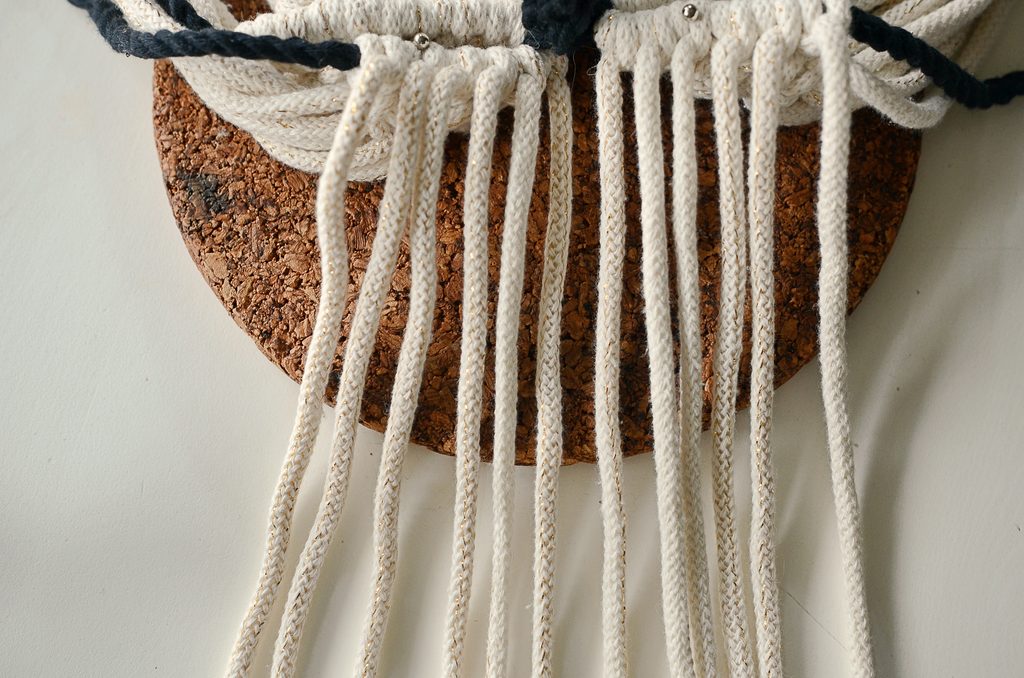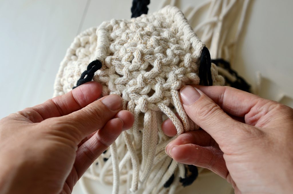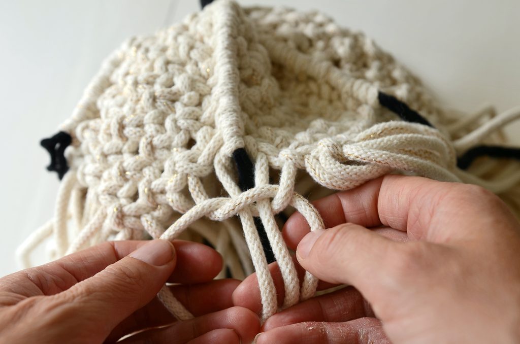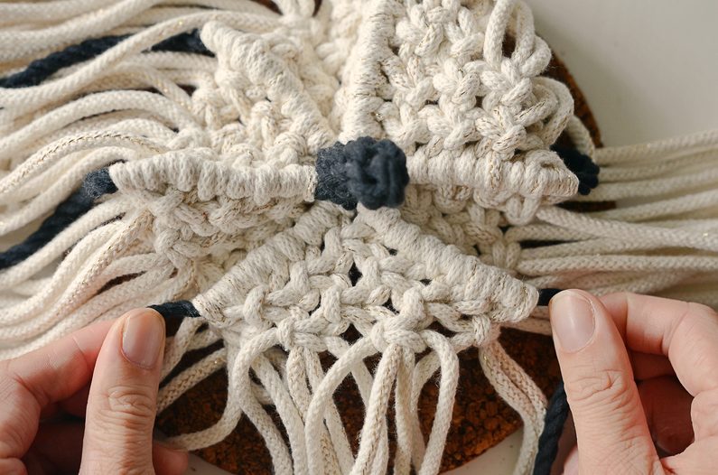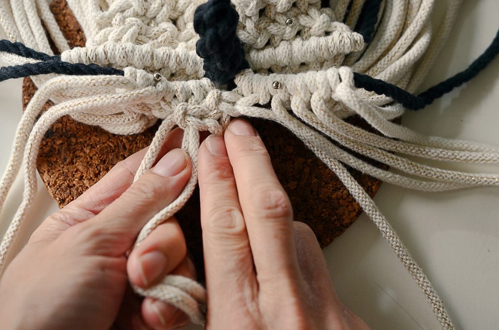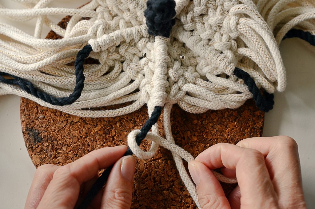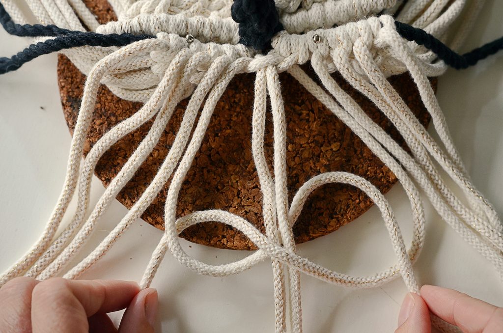 • Po dokončení tří řad je nutné prodloužit si „žebra“ dýně. Vždy dva nejbližší konce zleva a zprava kontrastní šňůry navažte dvojitým kroužkovacím uzlem. Opakujte po celém obvodu dýně. Tento krok budete opakovat nyní vždy ob jednu řadu.