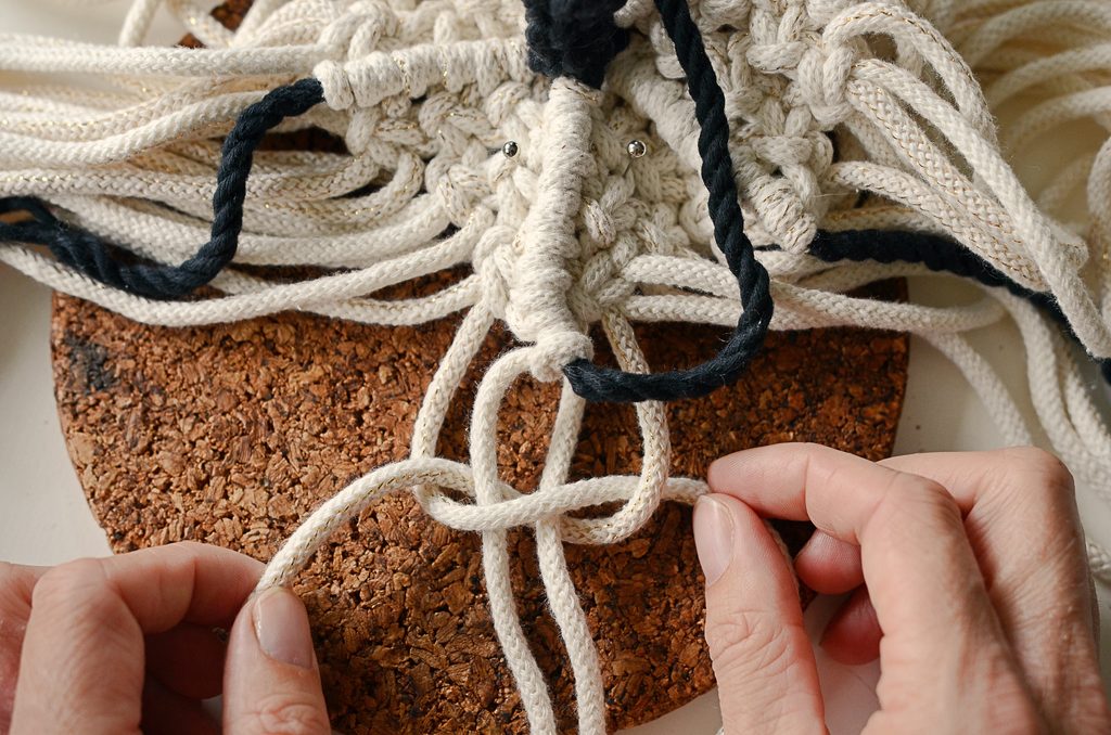 • Vraťte se na začátek k jednomu „žebru“ a oba nově navázané konce k sobě spojte plochým uzlem – kontrastní šňůra zůstane navrchu. Tento krok budete opakovat vždy ob jednu řadu.