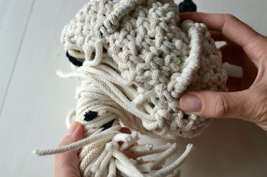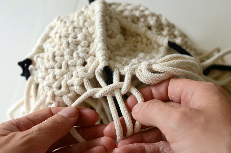 • Zakončete ještě jednou řadou, konce šňůr stočte a vycpěte jimi vnitřek.