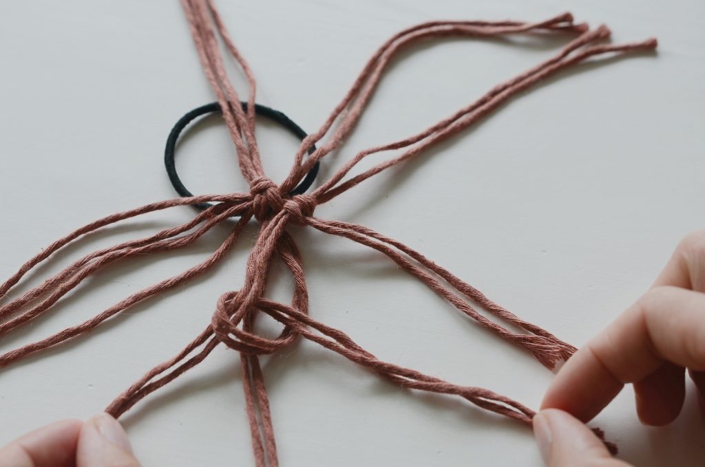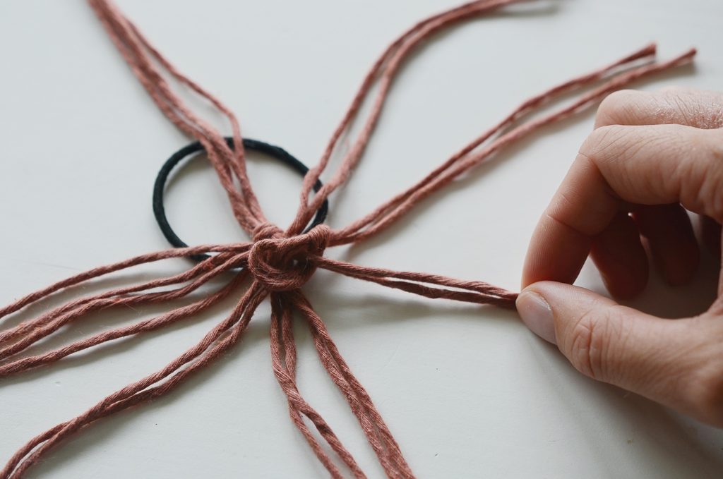 Konce rozdělte na dvě poloviny a svažte vždy párem 20 cm dlouhých šňůr. Klasický dvojitý uzlík schovejte dospod. Pevně stáhněte, aby byl střed mírně vystouplý.