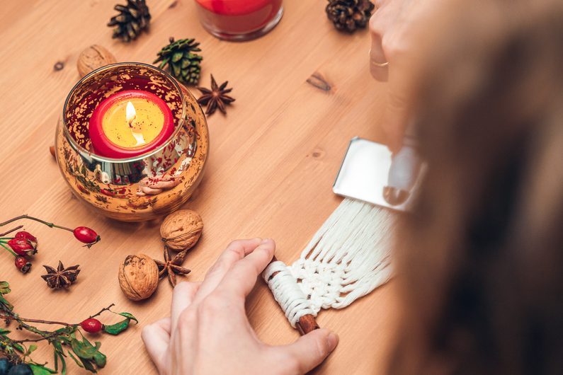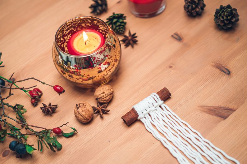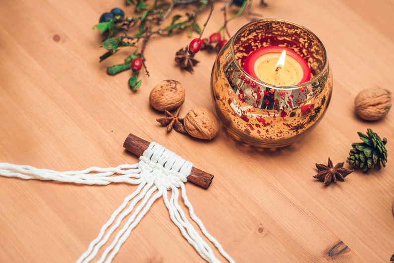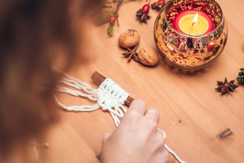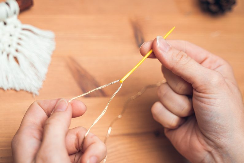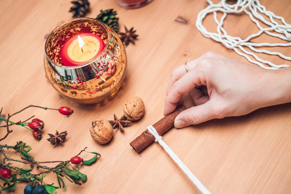 Zlatou přízi rozmotáme a provlečeme skrz skořici.