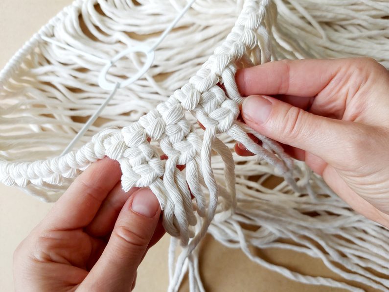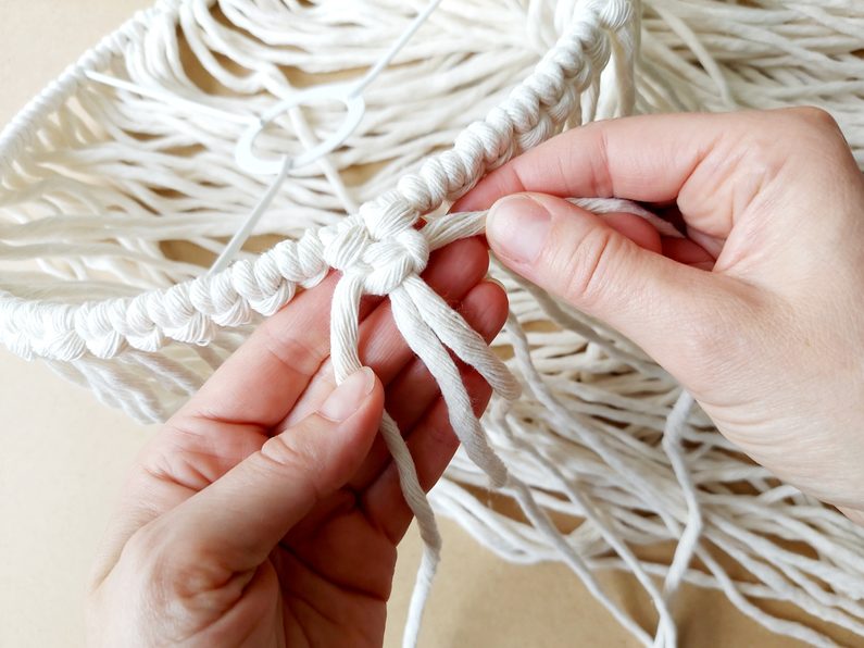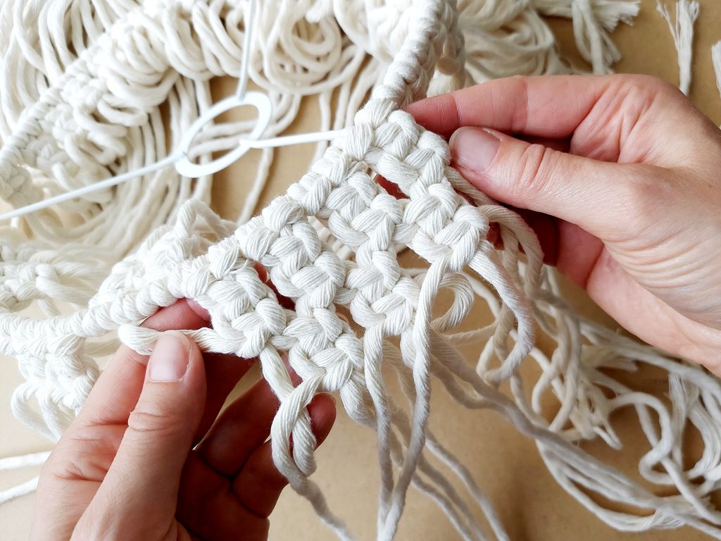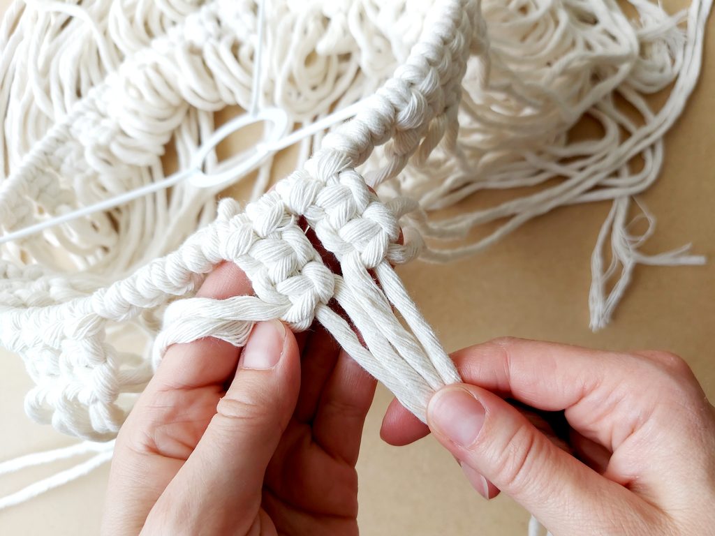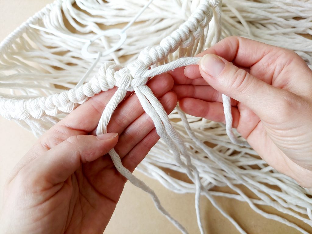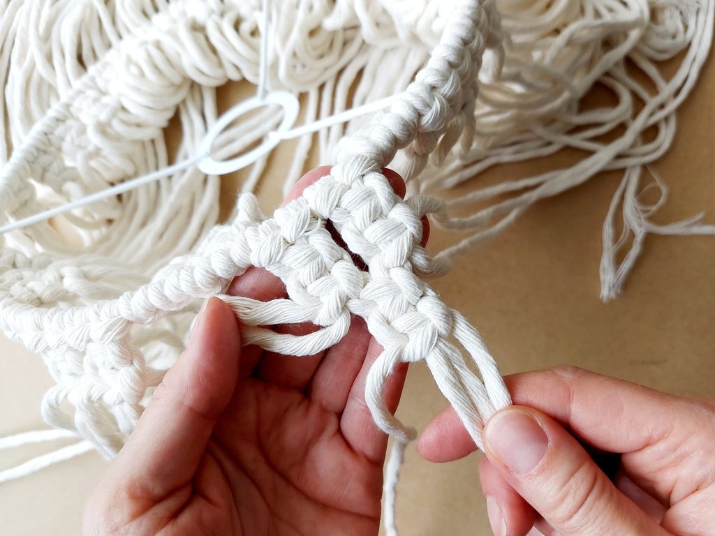 Obdobným způsobem pleteme i každou další řadu. Použijeme vždy dvě příze z každého předešlého uzle viz obrázky. Pleteme dle potřebné délky, v našem případě 5 řad.
