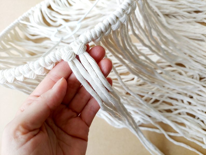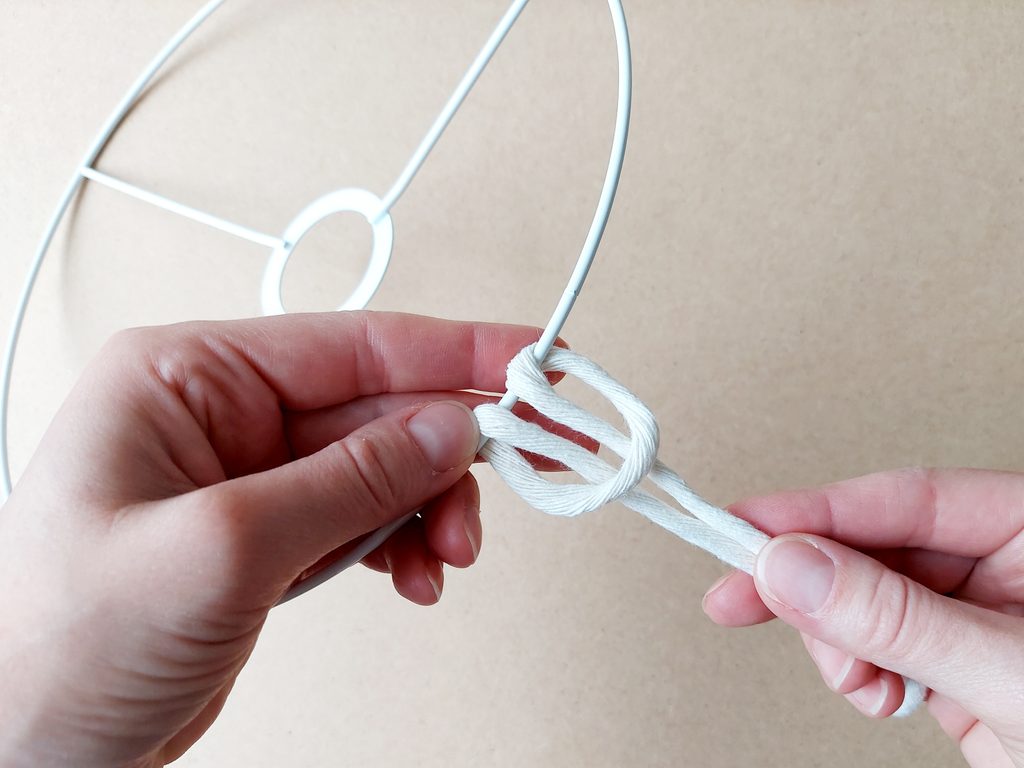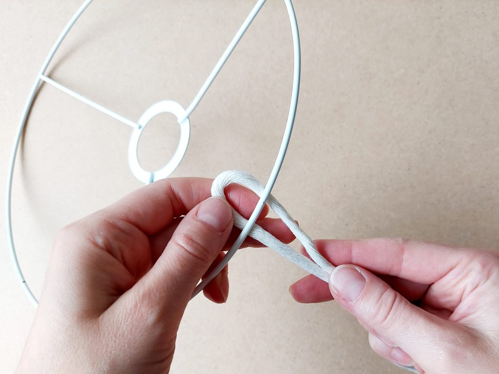 Připravíme si 68 kusů příze o délce 135 cm. Jednotlivé příze připevníme k základu stínidla základním upevňovacím uzlem.