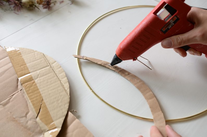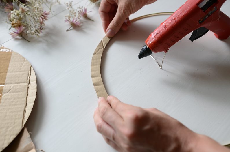 Rozmyslete si, jak velkou část z kruhu by měla zabrat květinová aplikace a podle toho si z kartonu vystřihněte úzký pruh – cca 2 centimetry široký. Nalepte jej na kruh pomocí tavné pistole.