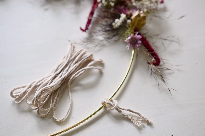 Nastřihejte si kusy macramé šňůry v délce přibližně 10 centimetrů. Podle vzoru je navazujte na kruh.