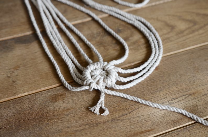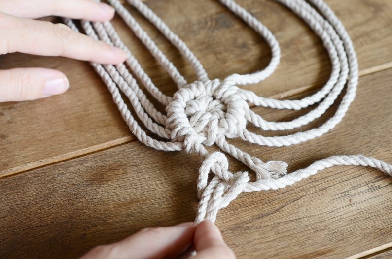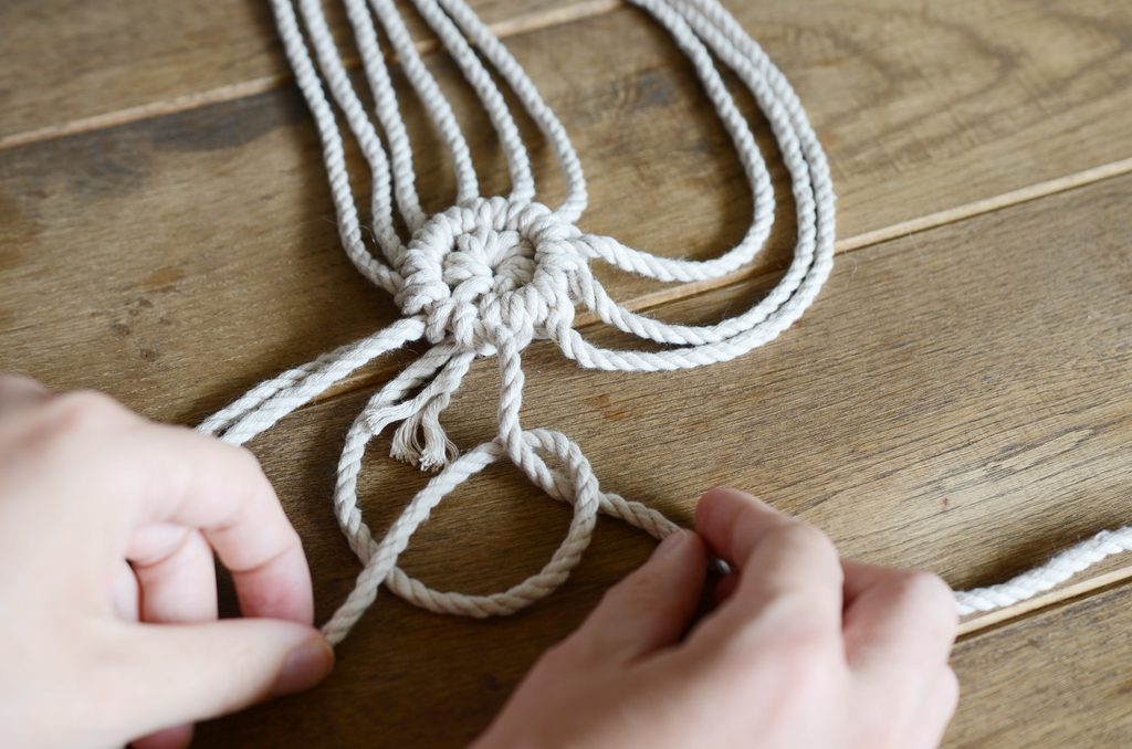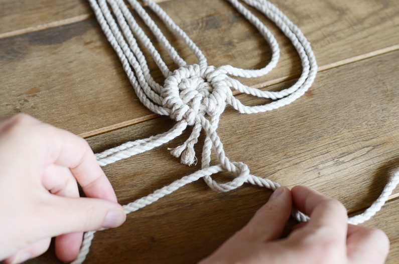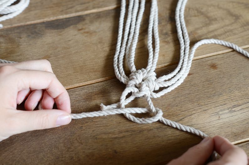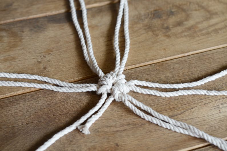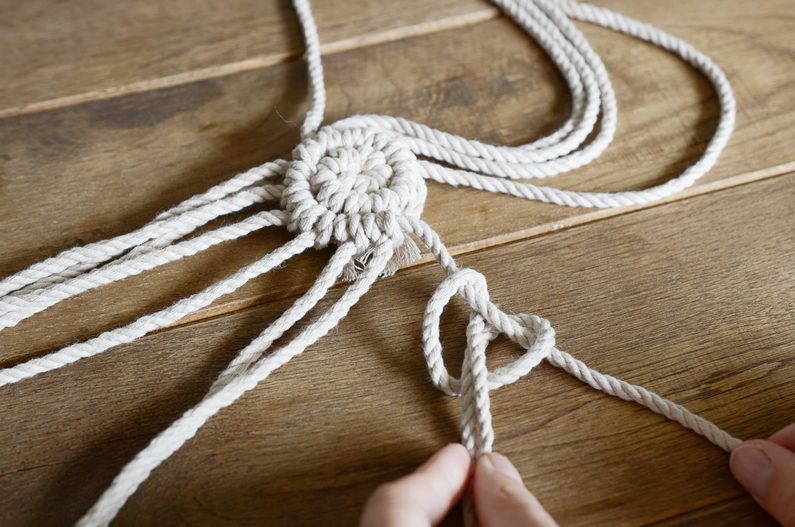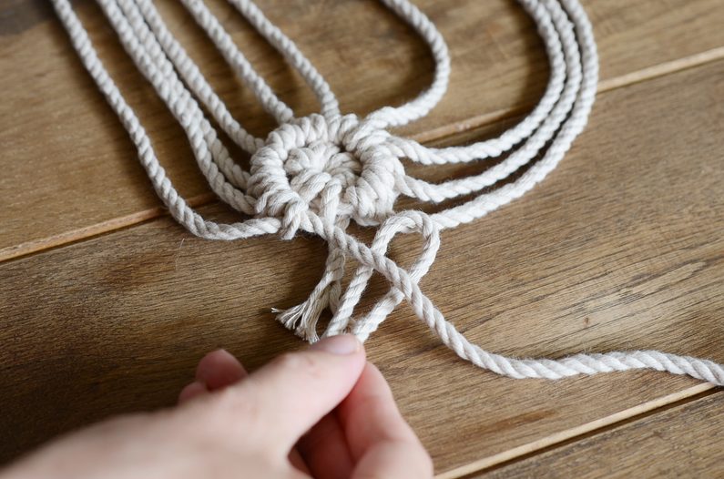 Po dokončení druhé řady si ustřihněte nový kus šňůry – přibližně 50 cm dlouhé. Zopakujte kroky 4 a 5, dokud vám nevzniknou celkem čtyři řady uzlíků kolem středu.