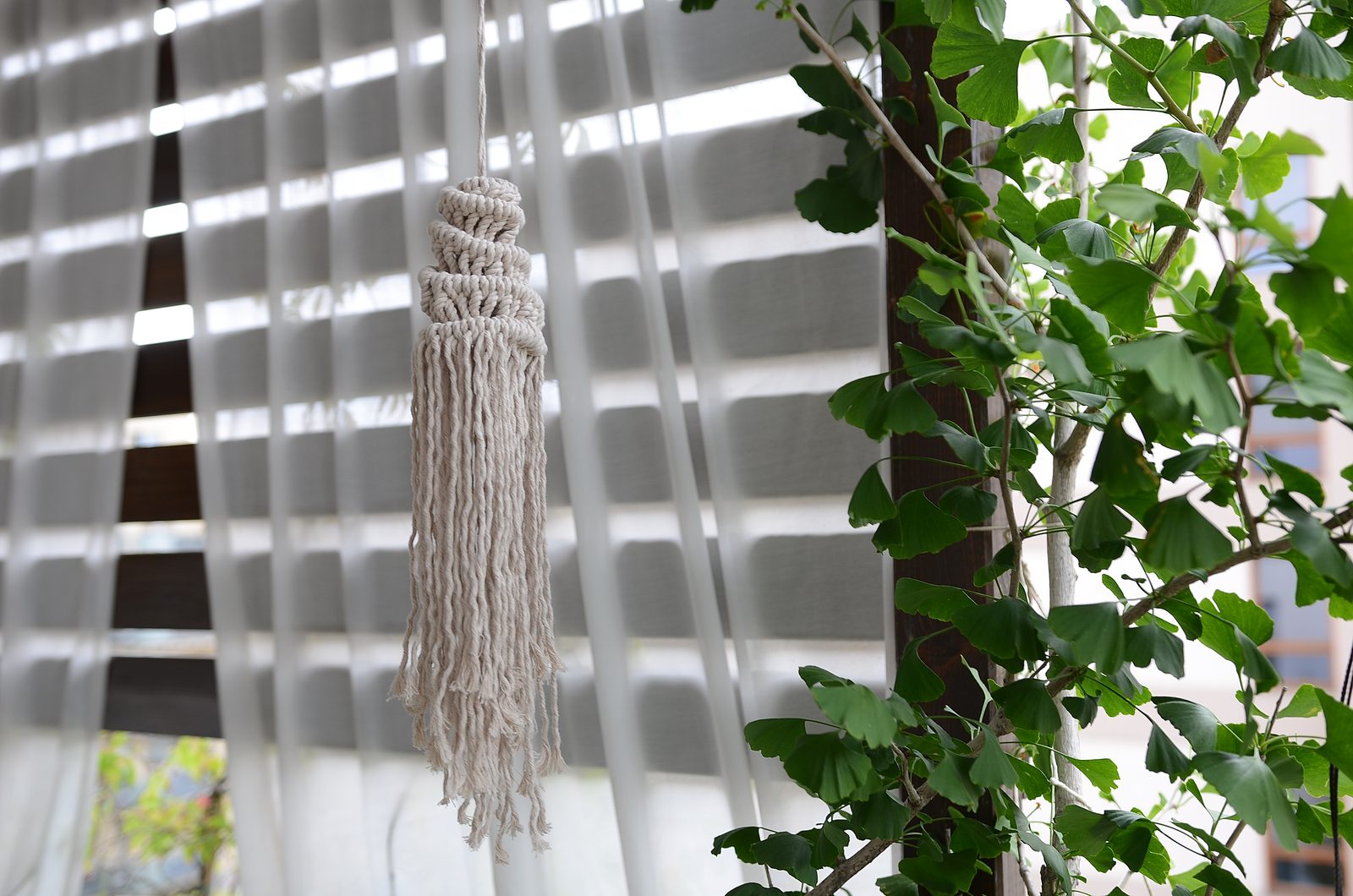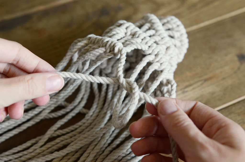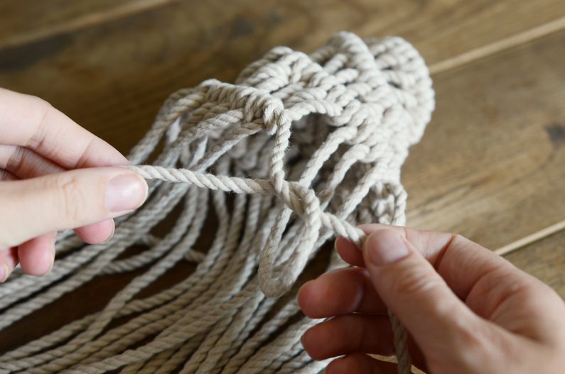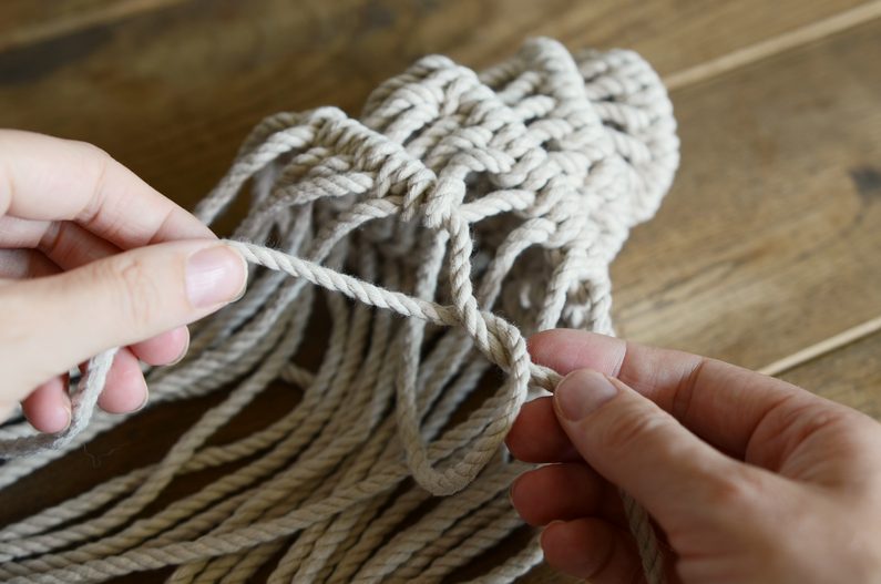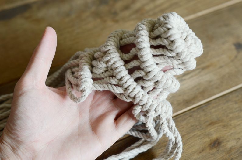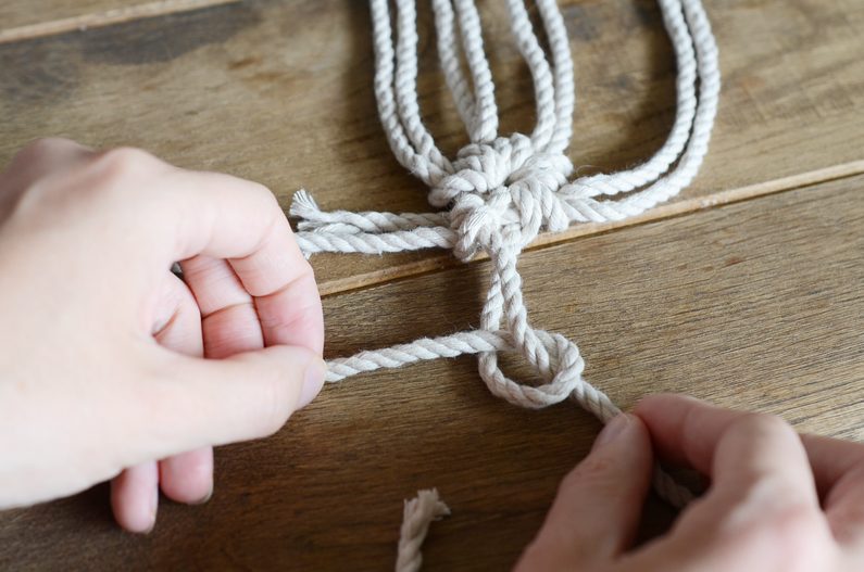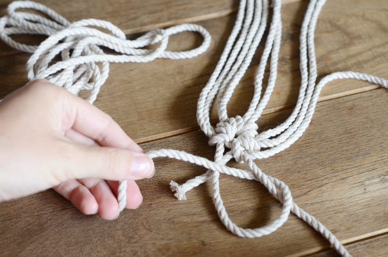 Po dokončení druhé řady si ustřihněte nový kus šňůry – přibližně 50 cm dlouhé. Zopakujte kroky 4 a 5, dokud vám nevzniknou celkem čtyři řady uzlíků kolem středu.