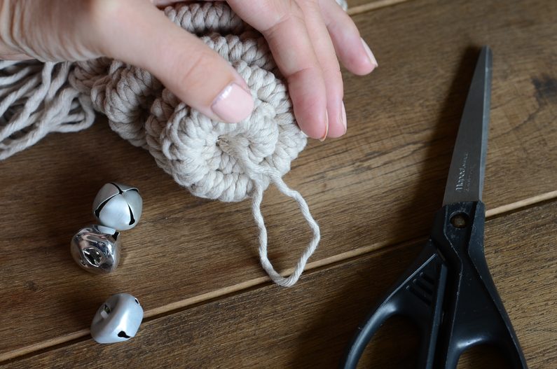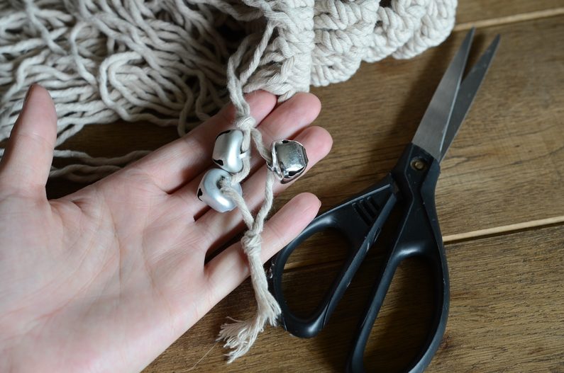 Podle požadované délky poutka udělejte zevnitř na provázku uzlík. Navlékněte rolničky, případně zvonek a zakončete opět uzlíkem. Poutko popotáhněte, dokud se nezarazí o uzlík.