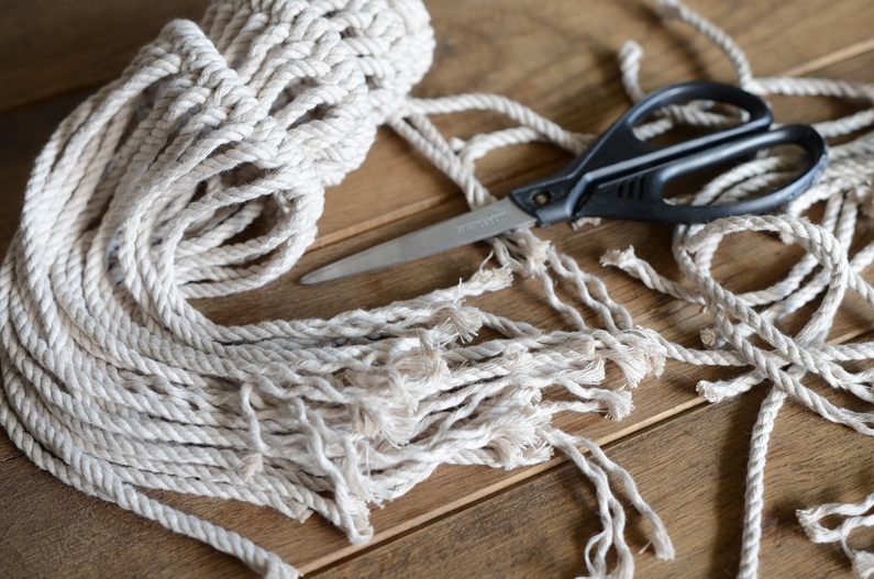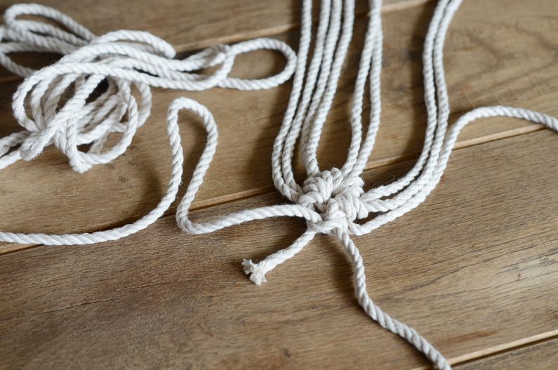 Ustřihněte si 1,5 metru dlouhý kus (vázací) šňůry – na tuto šňůru budete dále navazovat. Na jednom konci vytvořte očko. Poté si nastříhejte 5 kusů 60 cm dlouhých šňůr a navažte je podle návodu na očko.
