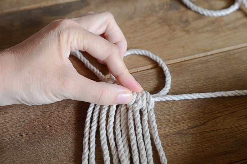 Pokračujte opět vázací šňůrou, na níž budete postupně proti směru hodinových ručiček navazovat druhou řadu dvojitých uzlíků pomocí volných konců.