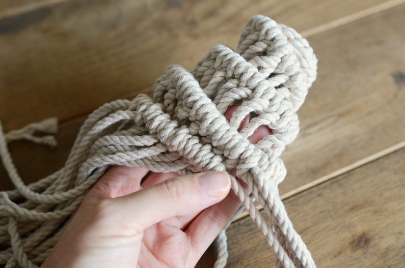 Jakmile dokončíte první řadu, ustřihněte si další kus šňůry – přibližně 55 cm dlouhou. Navažte podle návodu a utáhněte na vázací šňůru. Nechte volně, nyní s ní pracovat nebudete.