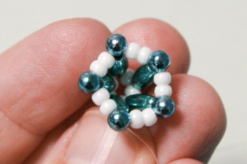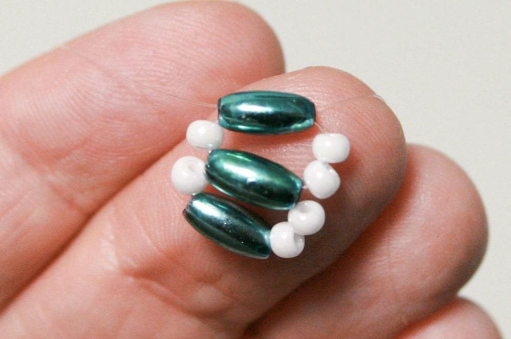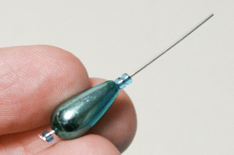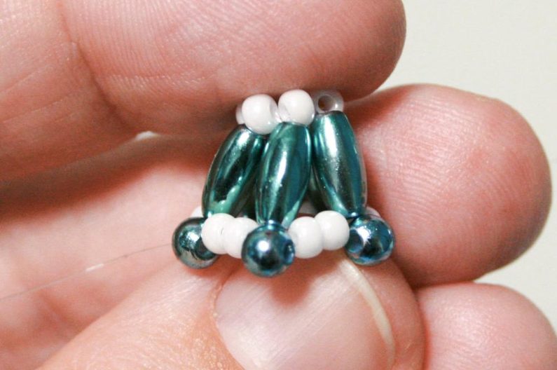 Na ketlovací očkovou jehlu navlékněete jeden rokajl R10, pak velkou kapku z mixu, pak dva rokajly R10 (obr. 12).