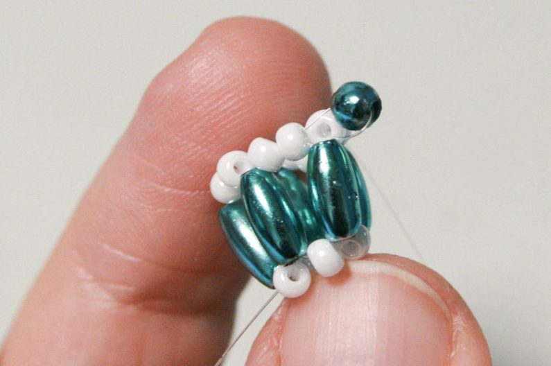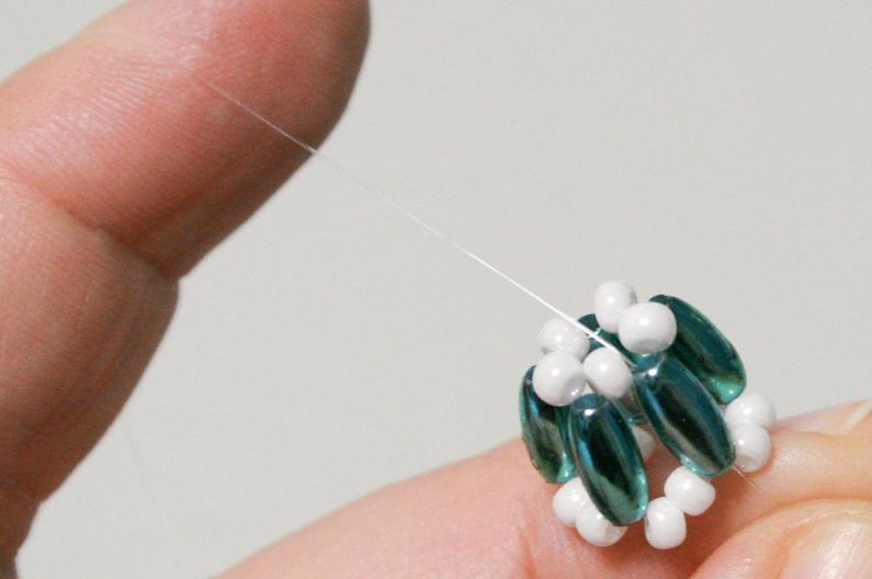Vyjděte jedním koncem vlasce ze strany, kde jsou dvojky rokajlu a pak mezi ty dvojky všijte perličky 4mm (obr. 7 - 9).