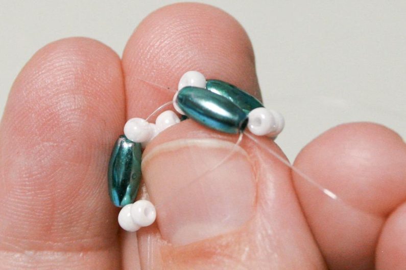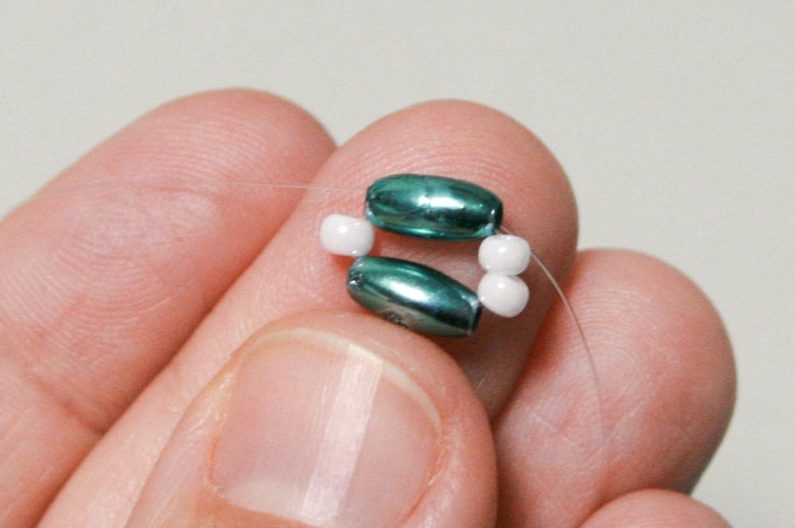 Dále opět na levou straánu vlasce navlékněte jeden R8, na pravou 2x R8 a pak provlékněte další trubičku z obou stran (obr. 2), opakujte postup ještě dvakrát (obr. 3 - 4).