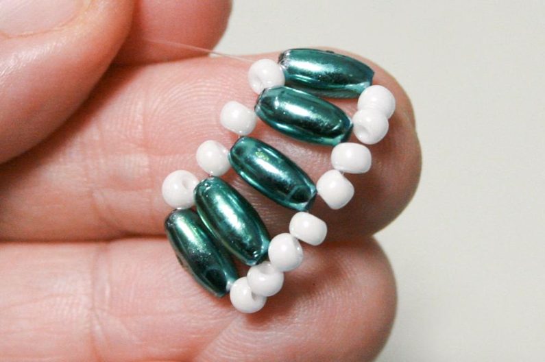 Druhým koncem vlasce vyjděte na straně kde jsou rokajly po jednom, mezi každými dvěma rokajly R8 všijte po jednom rokajlu R10 (obr. 10 - 11).