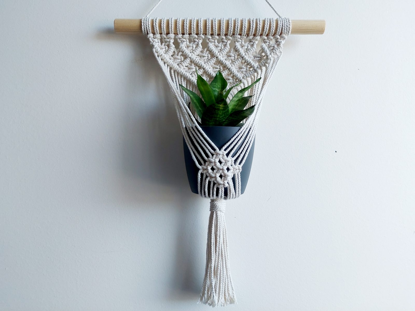 V druhé řadě pleteme opět plochý uzel. Vždy s dvojicí přízí z každého uzle v řadě první tak, aby nám vznikly pomyslné trojúhelníčky.
