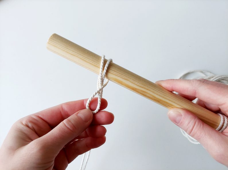 Připravíme si 20 kusů příze o délce 2 m, které k tyči upevníme viz obrázky. Vzniklé očko ze základního upevňovacího uzle před utažením přetočíme a následně konce znovu okem provlékneme.