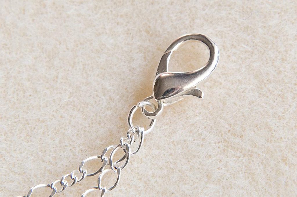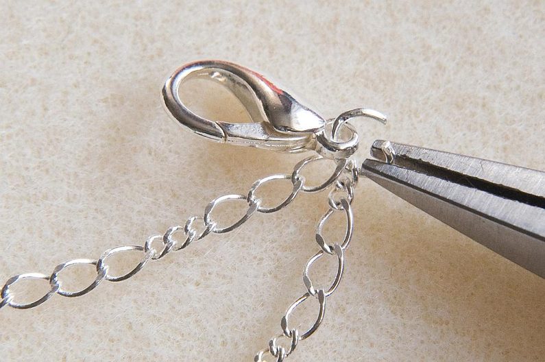 Nyní si oba řetízky spojíme. Do otevřeného spojovacího kroužku vložíme konce obou řetízků na jedné straně a také karabinku. (Obr. 11) Plochými kleštěmi kroužek uzavřeme. (Obr. 12) Totéž zopakujeme i na druhé straně, ale tam vložíme druhý konec zapínání. (Obr. 13)