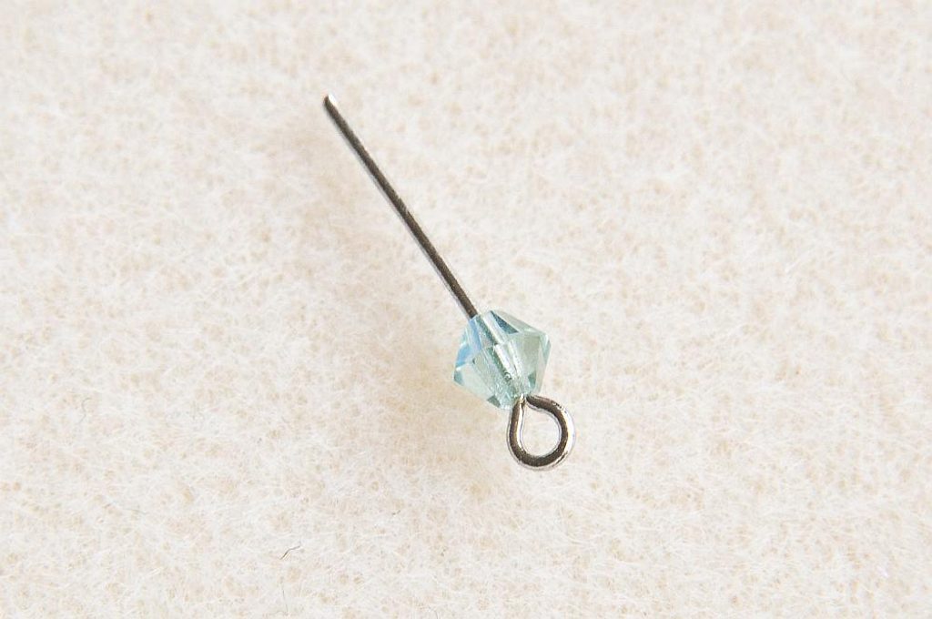 A teď si delší řetízek trochu ozdobíme. Připravíme si nejprve jednu větší ozdobu, která bude uprostřed. Na ketlovací očkovou jehlu 19 mm si navlékneme 1× cínovou perli 4 mm. (Obr. 14) Nad cínovkou si necháme cca 7 mm dlouhou jehlu, zbytek odštípneme. (Obr. 15) Kulatými ketlovacími kleštěmi uděláme očko, viz postup v Kroku 1. (Obr. 16)
