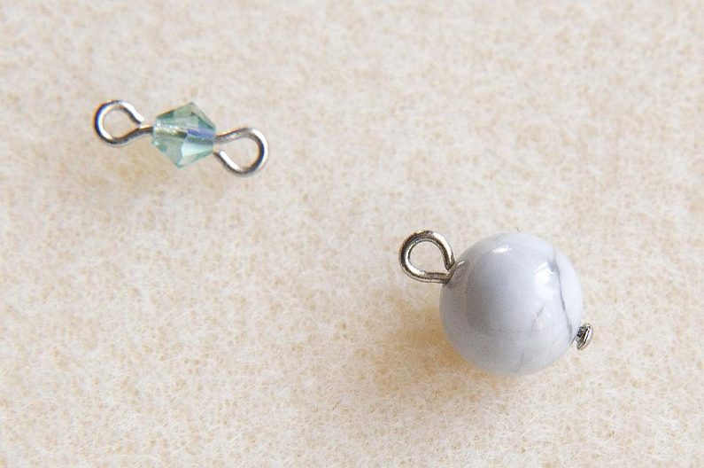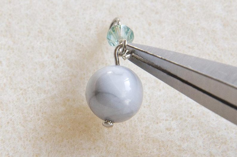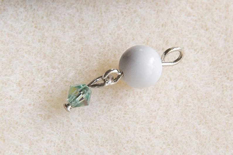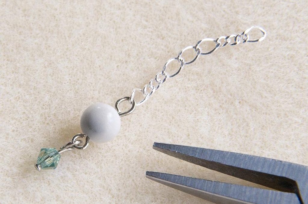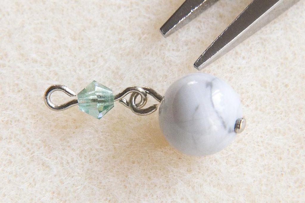 Na ketlovací nýtovou jehlu 19 mm navlékneme 1× bílou howlit kuličku 8 mm a stejným způsobem jako u cínovky vytvoříme očko. (Obr. 17) Očko si otevřeme do boku plochými kleštěmi a navlékneme do něj ketlovanou cínovku. (Obr. 18) Očko uzavřeme a máme připravenou první ozdobu. (Obr. 19)