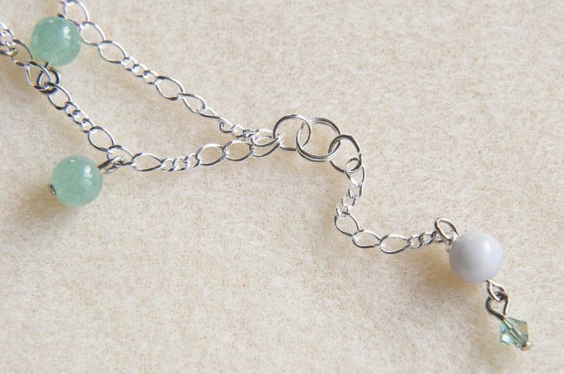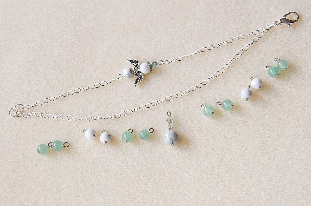 Dalšími ozdobami budou samostatné minerálové kuličky. Můžeme si udělat náramek „jednodruhový“, nebo kombinovat různé barvy. Já jsem zkombinovala dva minerály se stejnými účinky. Připravíme si je stejným postupem jako v Kroku 6, jen navlékáme kuličky 6 mm. Připravila jsem si 4 kuličky bílého howlitu a 8 kuliček avanturínu. (Obr. 20) Kuličky si rozmístíme k řetízku, jak nám bude vyhovovat. Můžeme je seskupovat k sobě, nebo je rozmístit pravidelně, můžeme také barvy různě střídat. (Obr. 21) Postupně budeme kuličky zavěšovat. Plochými kleštěmi si otevřeme očko do boku, navlékneme na očko řetízku a uzavřeme. (Obr. 22) Takto zavěsíme všechny kuličky. (Obr. 23)