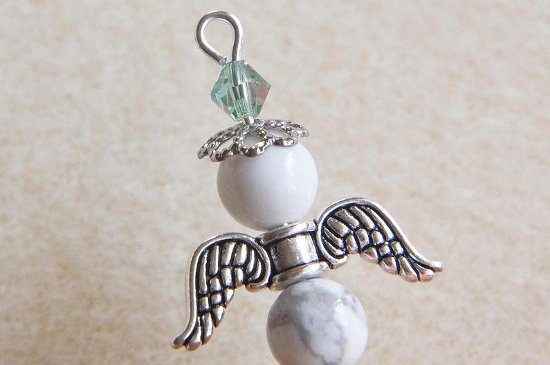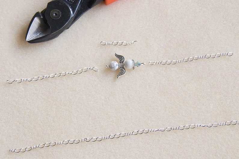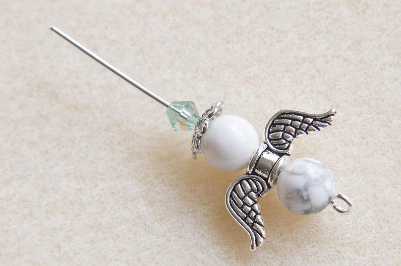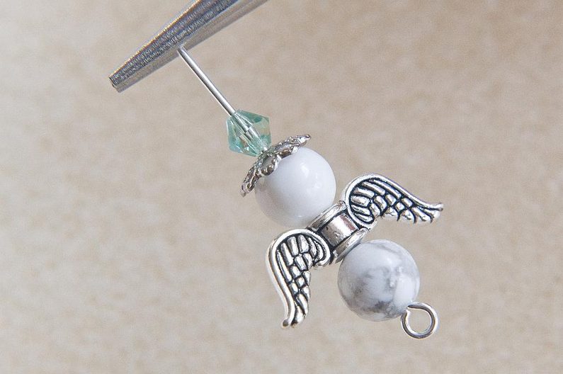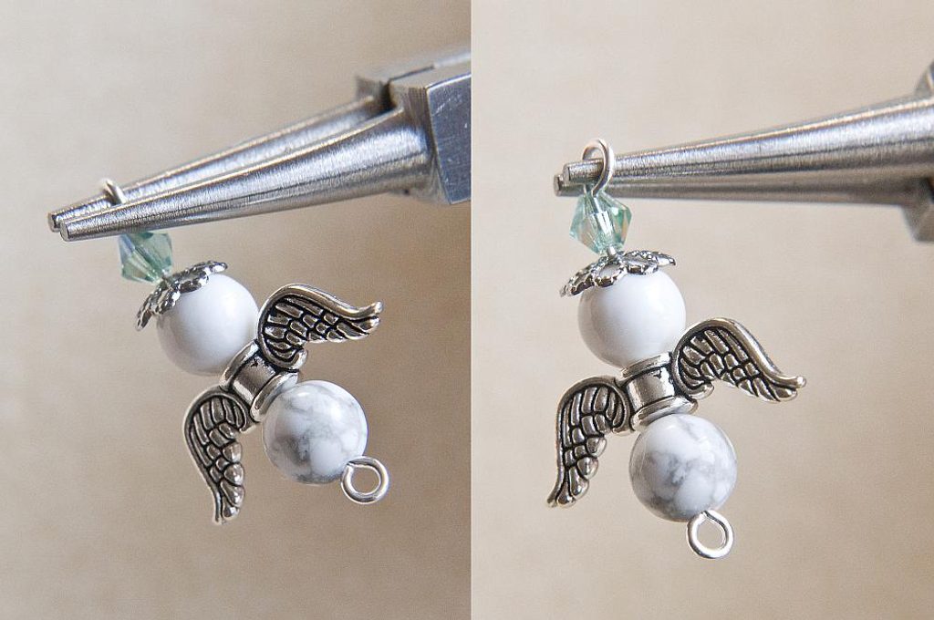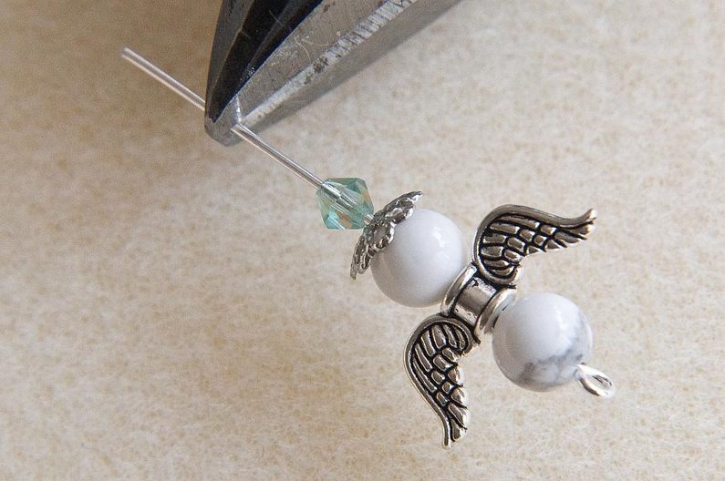 Nejprve si připravíme andílka. Na ketlovací očkovou jehlu 38 mm navlékneme postupně: 1× bílý howlit kuličku 6 mm, 1× křídla, 1× bílý howlit kuličku 6 mm, 1× kaplík a 1× cínovou perlu 4 mm. (Obr. 1) Jehlu zkrátíme štípacími kleštěmi cca 7 mm nad navlečenými korálky. (Obr. 2) Kulatými ketlovacími kleštěmi uchopíme konec jehly. (Obr. 3) Otáčivým pohybem kleštěmi silou jehlu ohneme až těsně k poslednímu korálku. Zadní stranu očka můžeme trochu ohnout v protisměru. (Obr. 4) Očko upravíme tak, aby bylo pěkně kulaté a zcela uzavřené. (Obr. 5)