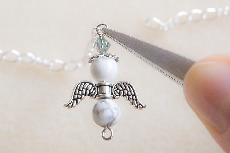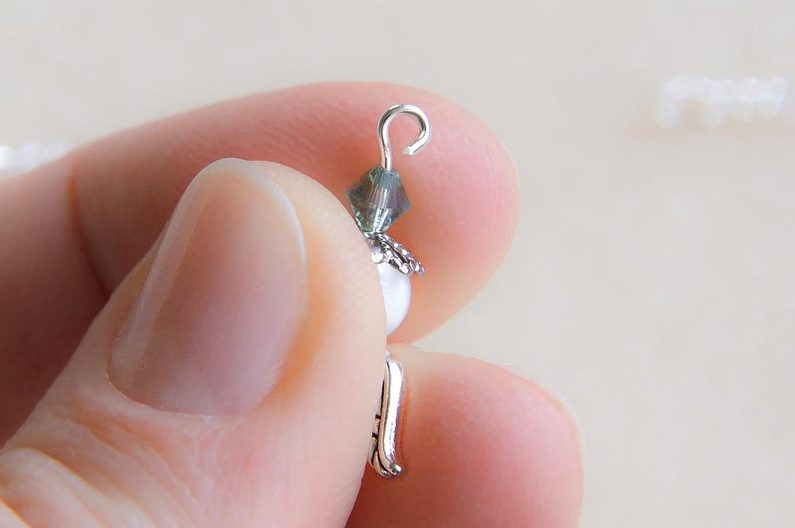 Plochými ketlovacími kleštěmi otevřeme do boku horní očko jehly andílka, opatrně, aby nám nevyklouzly navlečené korálky. (Obr. 8) Na otevřené očko navlékneme konec řetízku a kleštěmi očko znovu uzavřeme. (Obr. 9) Totéž zopakujeme i na druhé straně andílka. (Obr. 10)