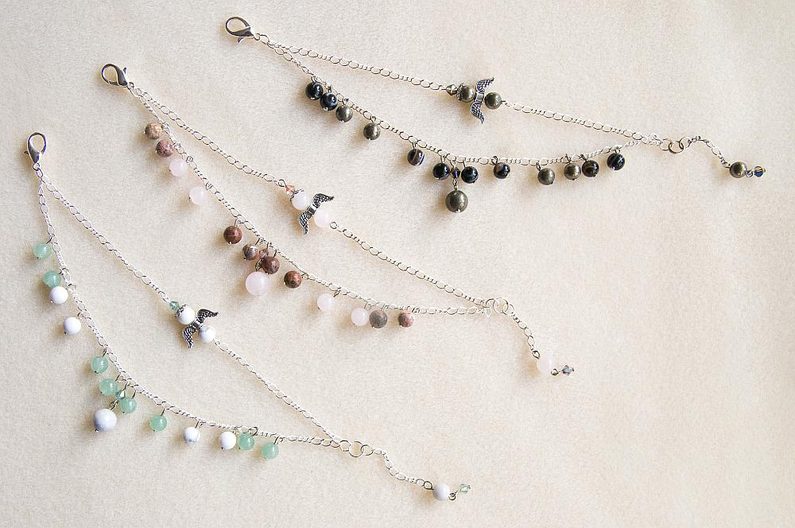 Nyní si ještě vyrobíme adjustační řetízek pro případné prodloužení náramku. Vyrobíme si ozdobu jako v krocích 5 a 6, v očkové jehle bude kulička avanturínu a v nýtové jehle cínovka. (Obr. 24) Ozdobu zavěsíme na konec řetízku, který nám zbyl. (Obr. 25) Spojovacím kroužkem zavěsíme adjustační řetízek na kroužek zapínání. (Obr. 26) Náramek je hotový a můžeme se pustit i do dalších barevných variant. (Obr. 27-28)