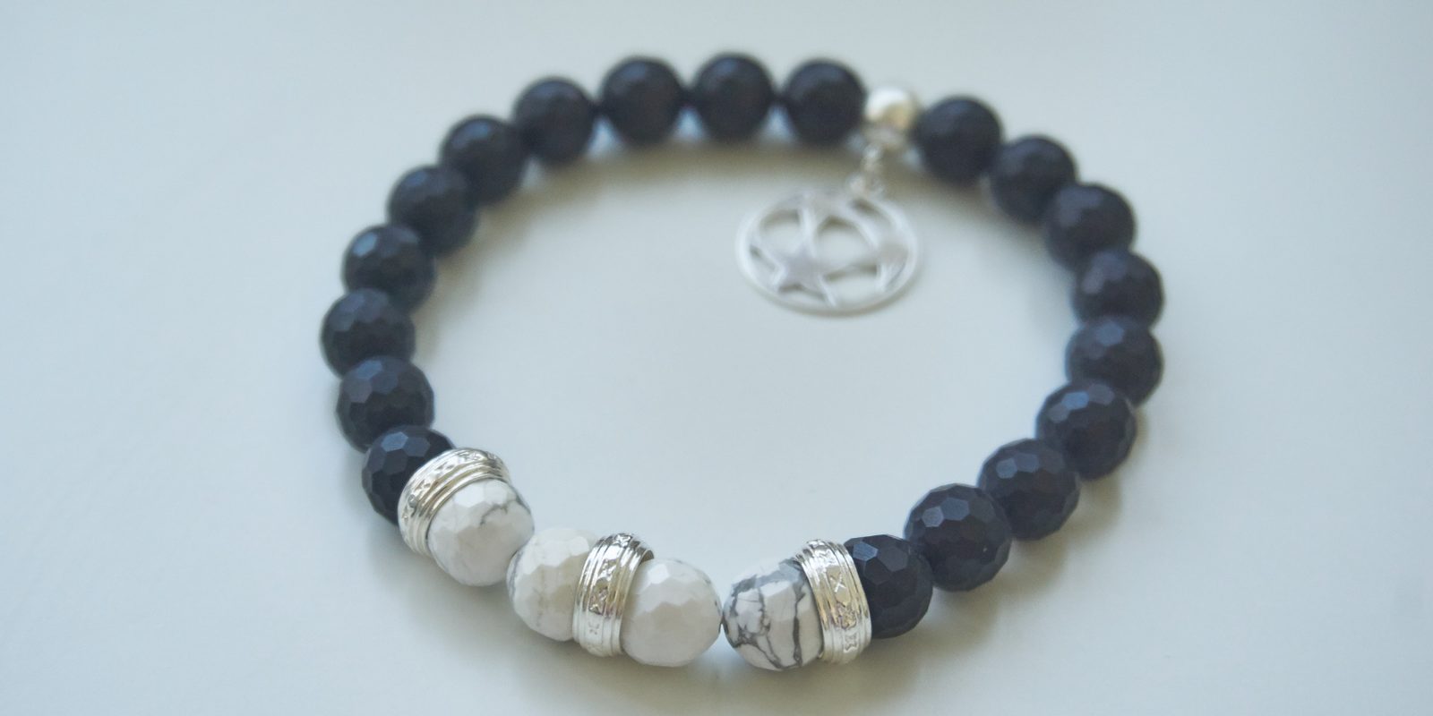 Poté stačí navlékat korálky a dle obrázkového vzoru. A na distanční kroužek poté připojíme pomocí ketlovacích kleští stříbrný přívěsek.