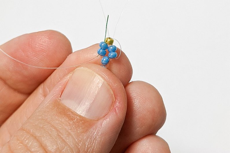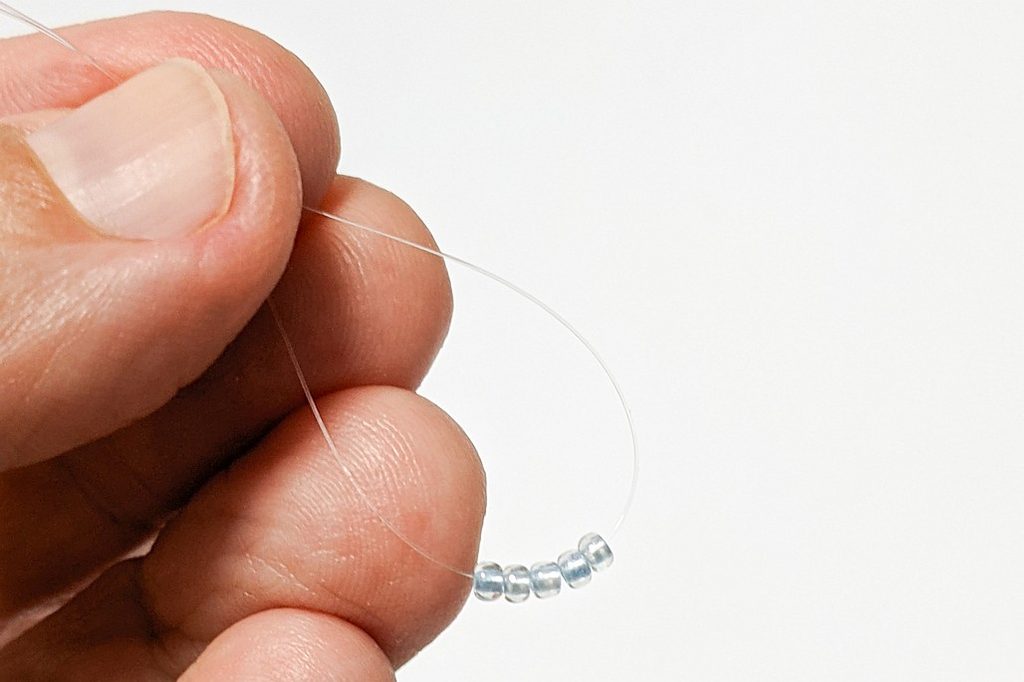 Vememe 5 korálků PRa a provlečeme oba konce vlasce posledním korálkem
