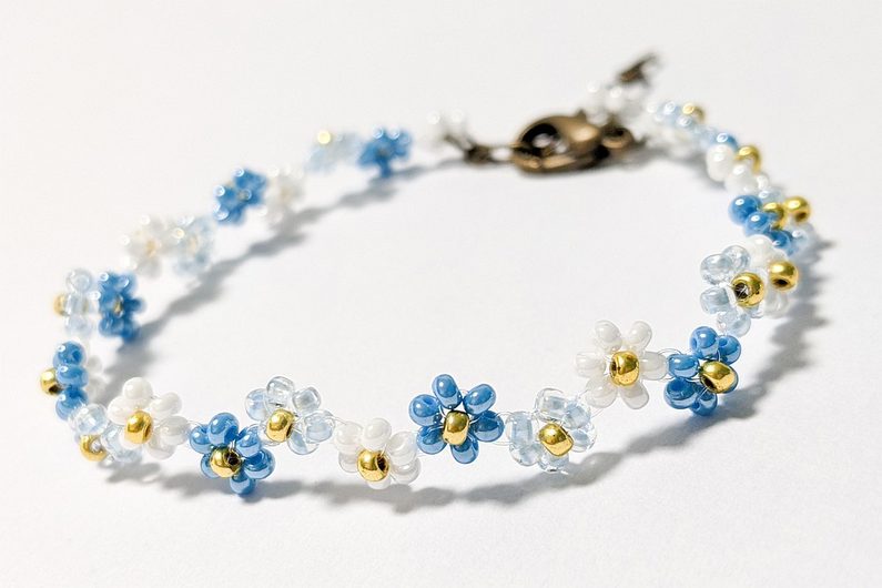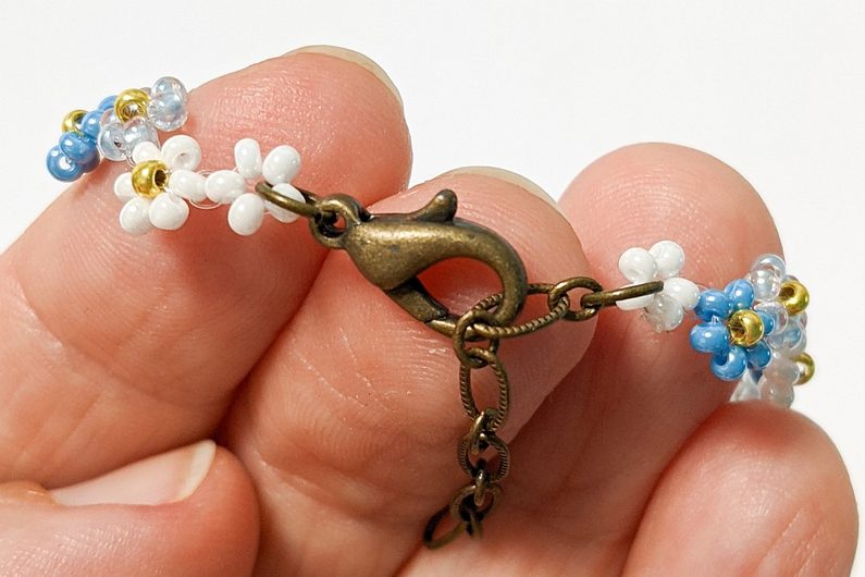 Až budete mít náramek požadované délky, ušijte očko z 5 korálků, do kterého pak připevníme zapínaní pomocí spojovacích kroužků (Obr.23-24). A pěkný kytičkový náramek máme hotový (Obr.25)