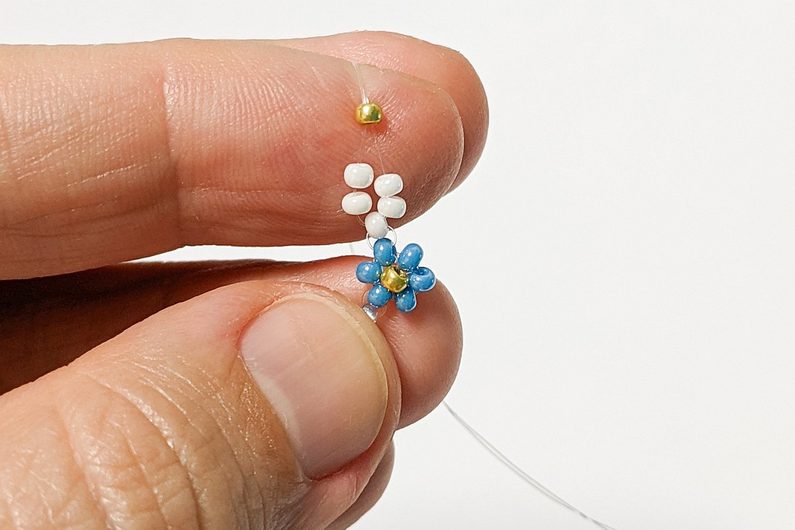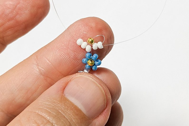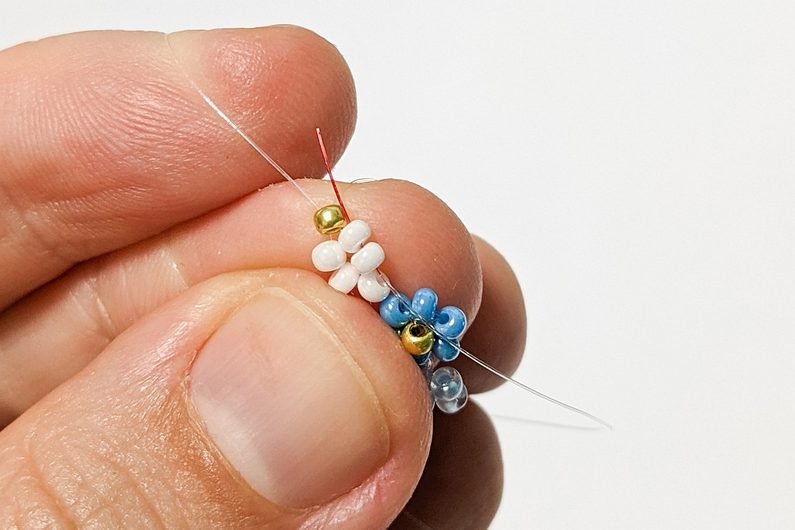 V dalším kroku šijeme podle Diagramu 2. Provlečeme každým koncem vlasce dva korálky Prb, které byly navléknuté v kroku 1 (Obr.7-8).