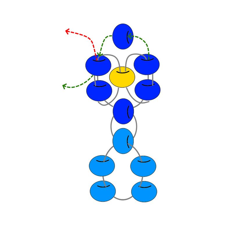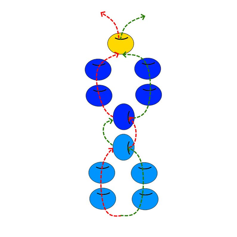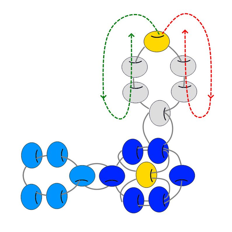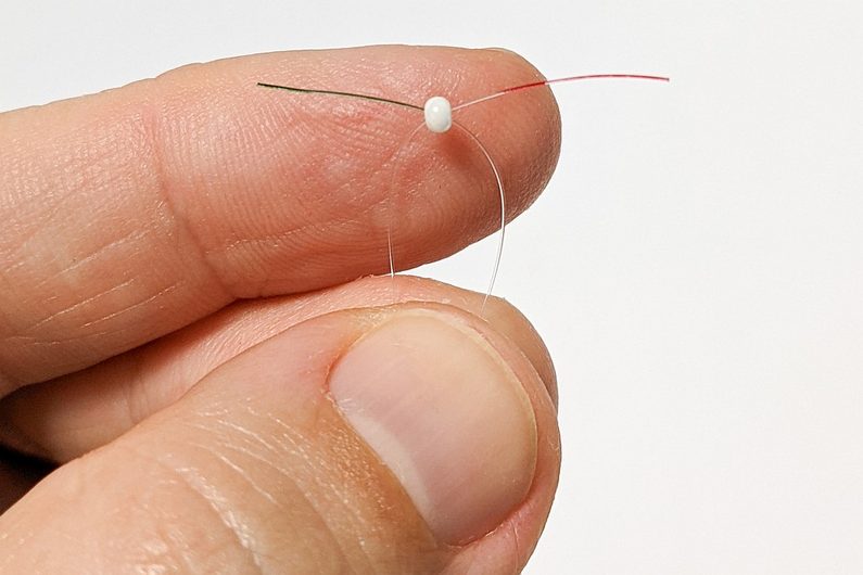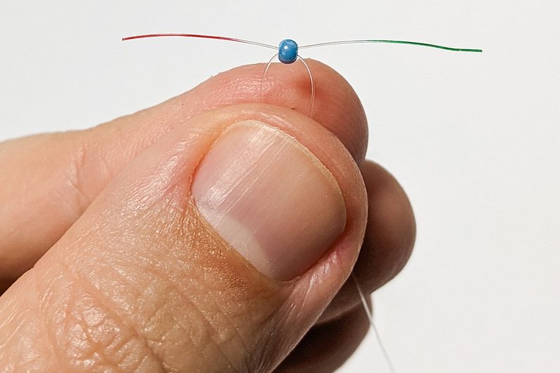 Na každý konec vlasce navlékneme dva korálky PRc a dále na oba konce navlékneme jeden korálek PRd (Obr.14). Provlečeme každým koncem vlasce dva korálky PRc, které byly navléknuté v kroku 1 (Obr.15-17).