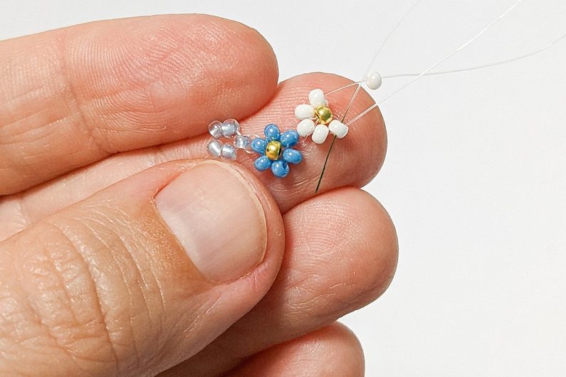 Šijeme podle Diagramu 6. Protáhneme oba konce vlasce tak, aby se korálek PRd dostal mezi korálky Prc (Obr.18). Navlékneme na levý konec vlasce korálek PRc a provlékneme ho posledním korálkem zprava (Obr.19-20). Všechny liché kytičky šijeme podle kroku 1-3 a všechny sudé kytičky podle kroků 4-5 (Obr.21-22)