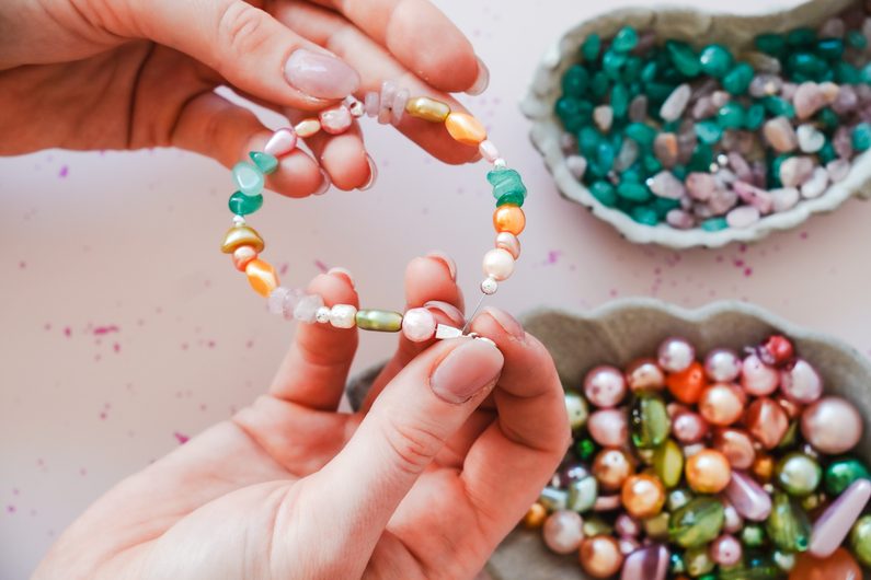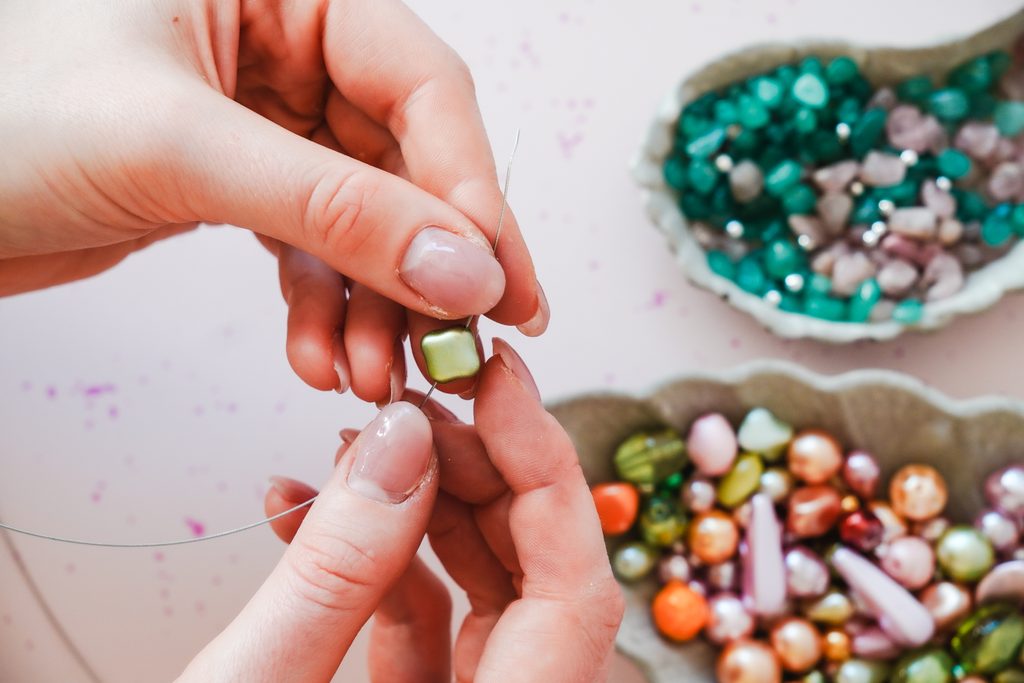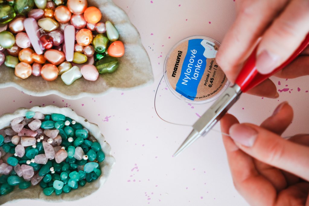 • Začneme navlékat korálky tak, jak se nám to líbí. Střídáme voskové perličky a zlomky z minerálů.