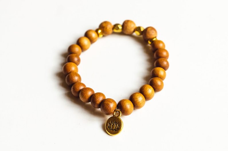 Na elastomer budeme navlékat dřevěné korálky, které prostřídáme s korálky Nuun Design . Jakmile dojdeme do poloviny náramku, navlékneme i Nuun Design přívěsek, zavěšený na spojovacím kroužku.