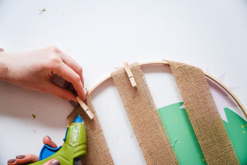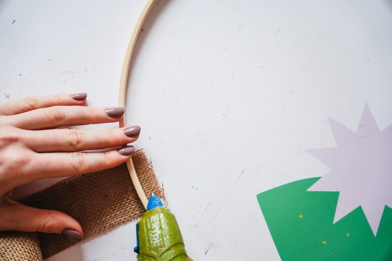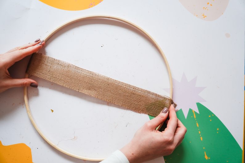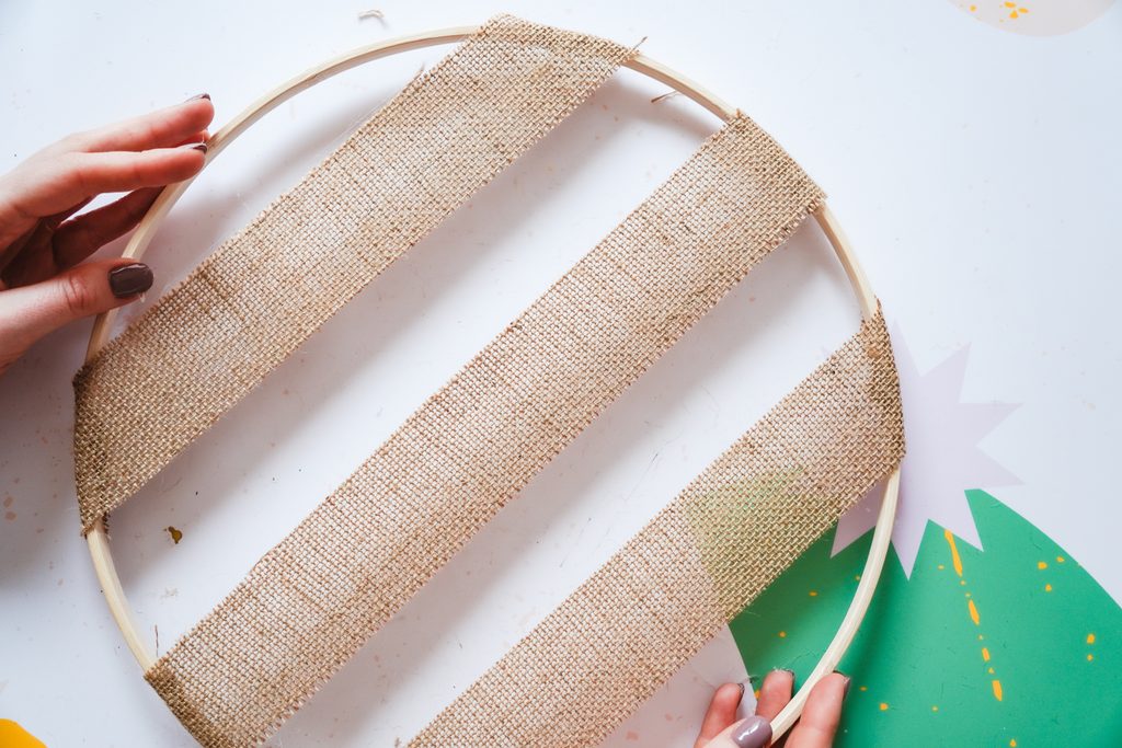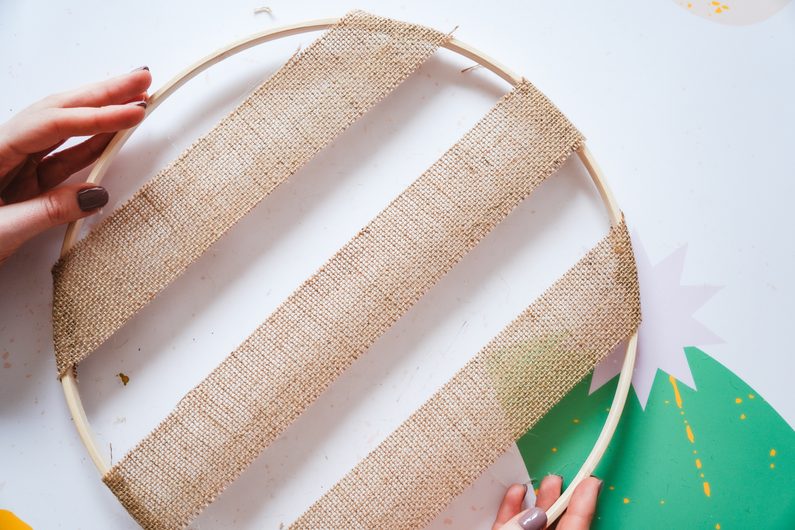 Na dřevěný kruh přilepíme pomocí tavné pistole 3 pruhy jutové stuhy. Začneme ideálně prostředním, abychom měli mezi všemi stejné mezery.