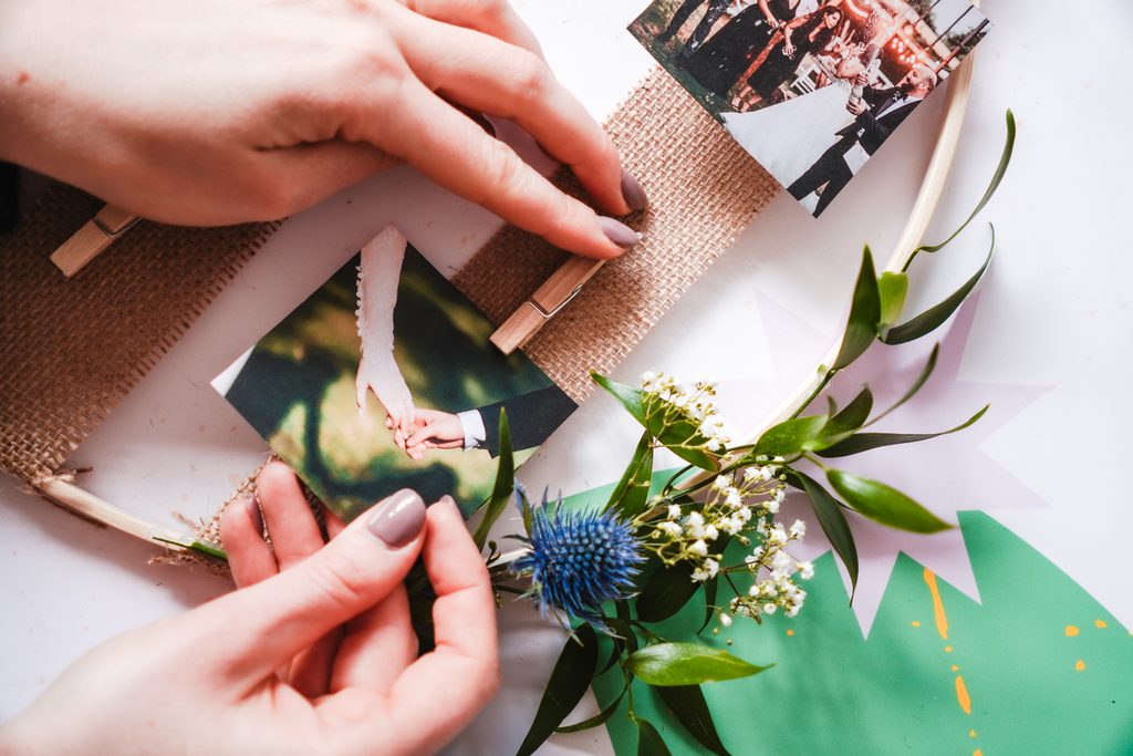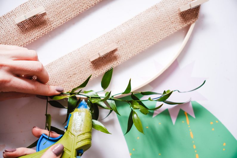 Následně tavnou pistolí přiděláme po obvodu sušené nebo živé květiny, například eukalyptus, modrý bodlák nebo jiné, které se nám líbí. Nakonec přivážeme nebo přilepíme provázek na zavěšení. Můžeme dozdobit dřevěným korálkem