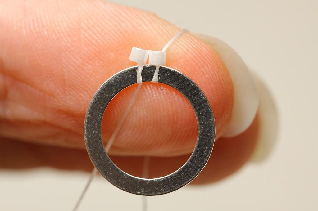 Na jehlu navlékneme nymo a to protáhneme kroužkem a uděláme jednoduchý volný uzlík. Navlékneme 2x MD11, jehlu vedeme kroužkem zezadu dopředu a protáhneme ji druhým korálkem tak, aby se oba umístily dírkou kolmo ke kroužku.