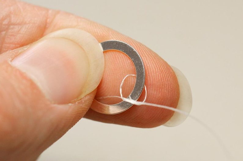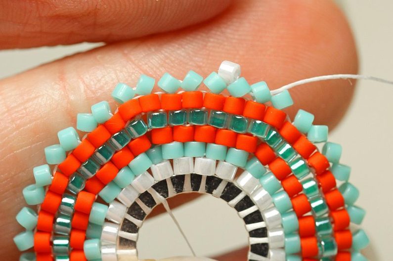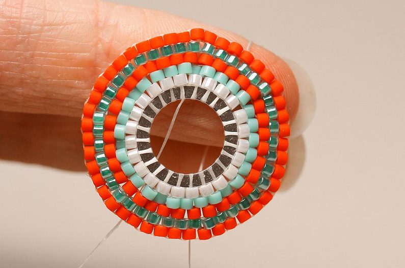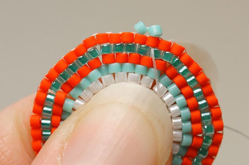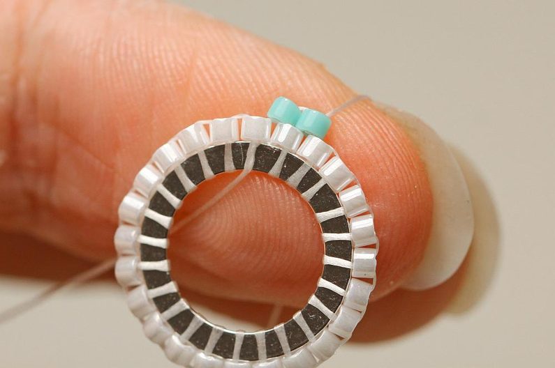 Opakujeme dokola, až máme hotovou celou řadu – celkem by to mělo být 24 korálků. Poslední korálek spojíme se začátkem řady protažením shora, jehlu pak vedeme druhým korálkem zespodu nahoru, aby jehla vycházela nahoře, vně obšívaný kroužek.