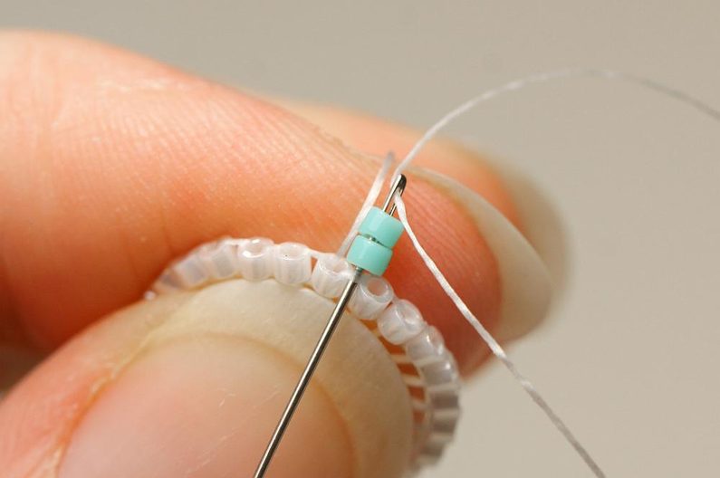 Jehlu provlékneme druhým korálkem z nové řady opět tak, aby se korálky postavily dírkou kolmo k obvodu. Utáhneme.